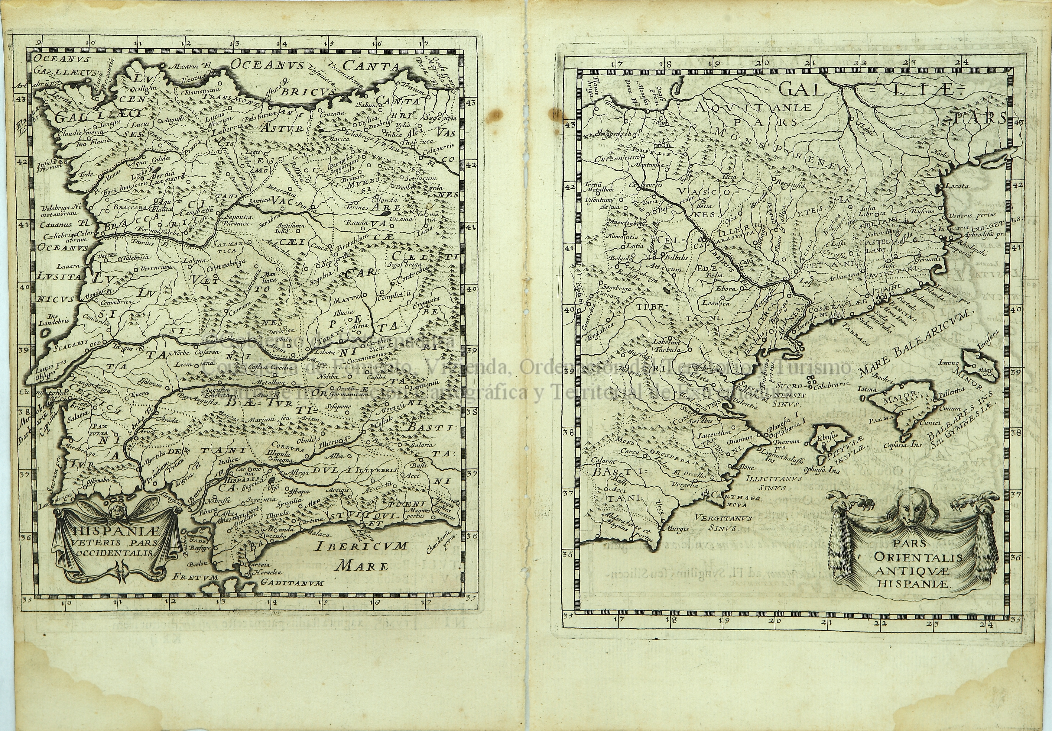 NOTAS En: Briet, Phillippe. ”Theatre Geographique de l´Europe…”, (1601-1668). – Relieve por montes de perfil y sombreado. – Márgenes graduados. – Red hidrográfica. Costas sombreadas por pequeño rayado. – Divisiones administrativas por ligera línea de puntos. – Representa las ciudades a través de círculos según su importancia. – Datos de la publicación sacados de la obra en la que se incluye. – Cartela en tela con simple angelote en el ángulo inferior izquierdo: “Hispaniae Veteris Pars Occidentalis”. Cartela en tela con animal fantástico en el ángulo inferior derecho: “Pars Orientalis Antiquae Hispaniae” |
