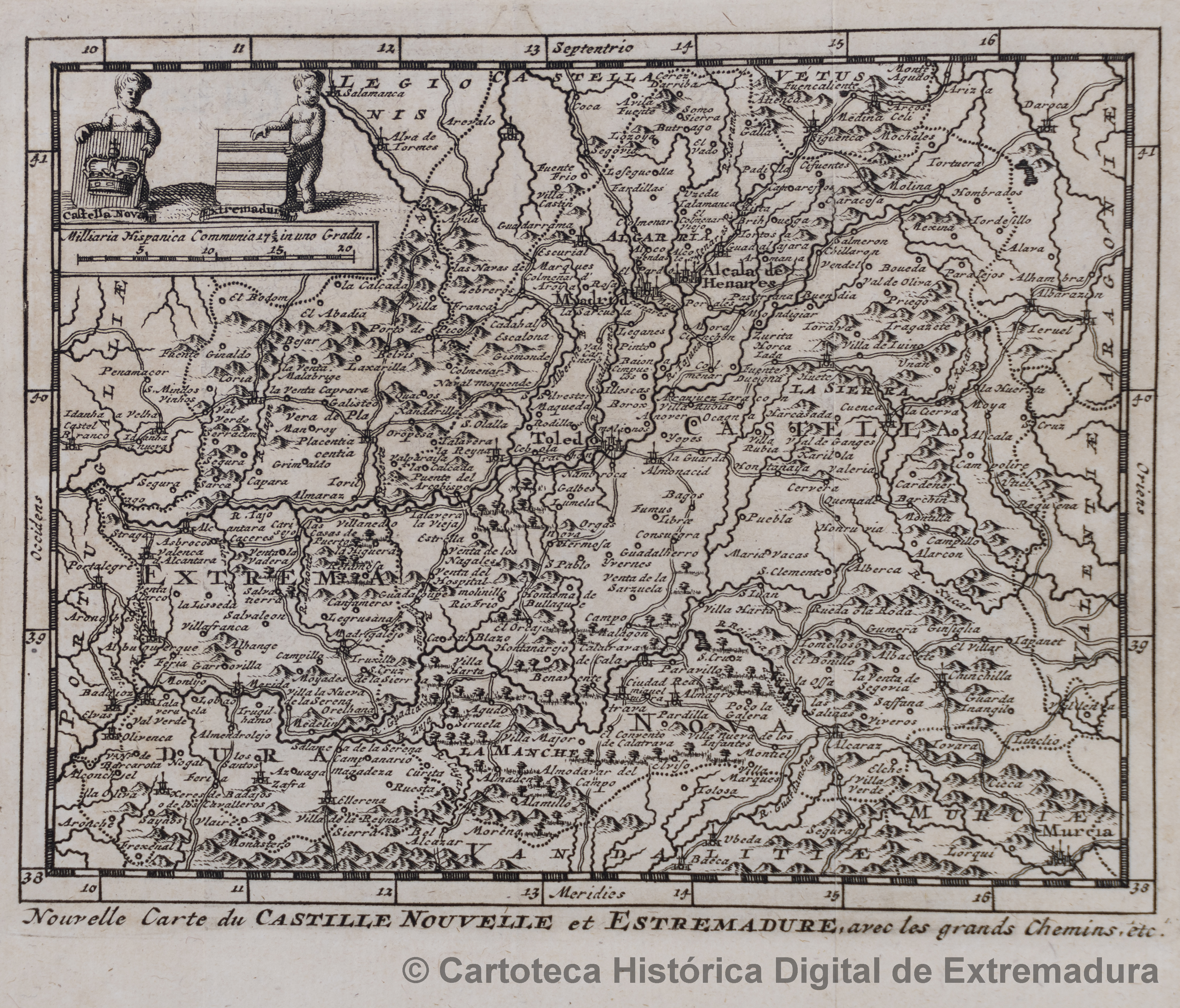 NOTAS Abarca la actual provincia de Castilla-La Mancha y la frontera con Portugal y Galicia. – Abundante toponimia. – En: Álvarez de Colmenar, Juan: “Annales d´Espagne et de Portugal : contenant tout ce qui s´est passé de plus important dans ces deux royaumes & dans les autres parties de l´Europe de même que dans les Indes orientales & occidentales depuis l´établissement de ces deux monarchies jusqu´à présent : avec la description de tout ce qu´il y a de plus remarquable en Espagne & en Portugal, leur etat present, leurs interets, la forme du gouvernement, l´étendue de leur commerce, &c.”,[1707-1741?], Tomo 1. – Orientado. – Relieve por montes de perfil y sombreado. – Márgenes graduados. – Red hidrográfica y de comunicaciones. – Representa las divisiones administrativas por líneas de puntos. – Indica mediante planos las ciudades según su importancia. El resto de ciudades las representa mediante pequeños círculos. – Arbolado. – Encima de la escala dos niños sujetando cada uno los escudos de Castilla y Extremadura. – Datos de la publicación sacados de la obra en la que se incluye |