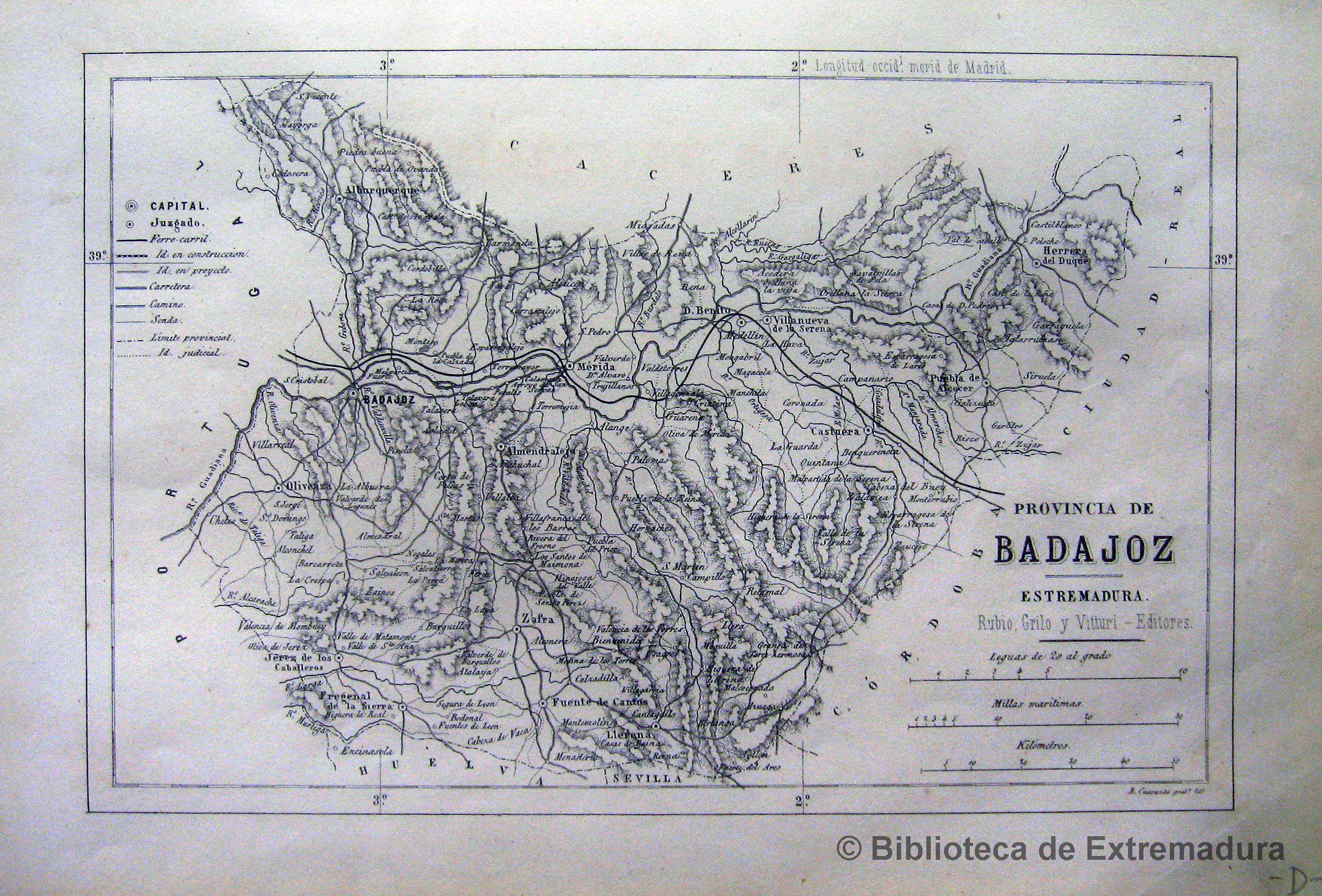 NOTAS Inserta clave por símbolos de las capitales, los juzgados, y las distintas redes de comunicaciones como el ferrocarril, las carreteras, los caminos y las sendas. – En: Cuaranta, B. ´Reseña Geográfico – Histórica de las Provincias de España´. Rubio, Grilo y Vitturi, 1868 (Madrid : impr. J. Morete). – Relieve por normales y sombreado. – Márgenes graduados. Red de meridianos y paralelos formando cuadrícula. Longitud Occid. de meridiano de Madrid. – Red hidrográfica y de comunicaciones. – Divisiones administrativas por líneas discontinuas. – Datos de la publicación sacados de la obra en la que se incluye |