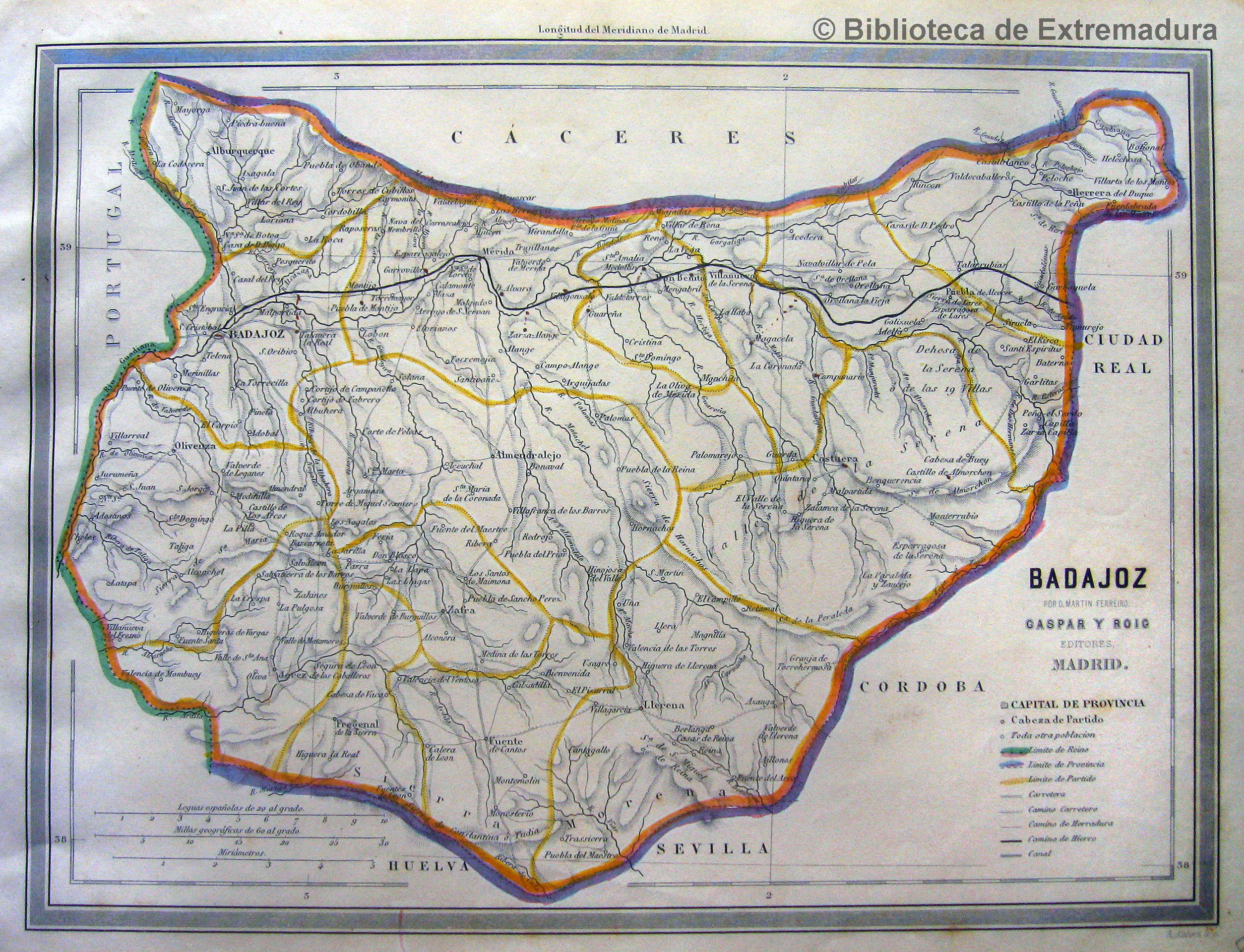 NOTAS Escala también en Millas geográficas de 60 al grado y en Miriámetros. – En: Ferreiro, Martín. “Atlas geográfico de España, islas adyacentes y posesiones españolas de ultramar”. Grabado por Ramón Alabern Casas. – Relieve por normales y sombreado. – Márgenes graduados. Red de meridianos y paralelos formando cuadricula. Meridiano de origen: Madrid. – Red hidrográfica y de comunicaciones. – Divisiones administrativas y contornos diferenciados por líneas de color. – Clave por símbolos en el que se indican las capitales de provincia, la cabeza de partido, poblaciones, con los límites del Reino, de la Provincia, y del partido junto con carreteras, camino carretero, de herradura y de hierro. – Fecha de publicación tomada del atlas en el que se incluye |