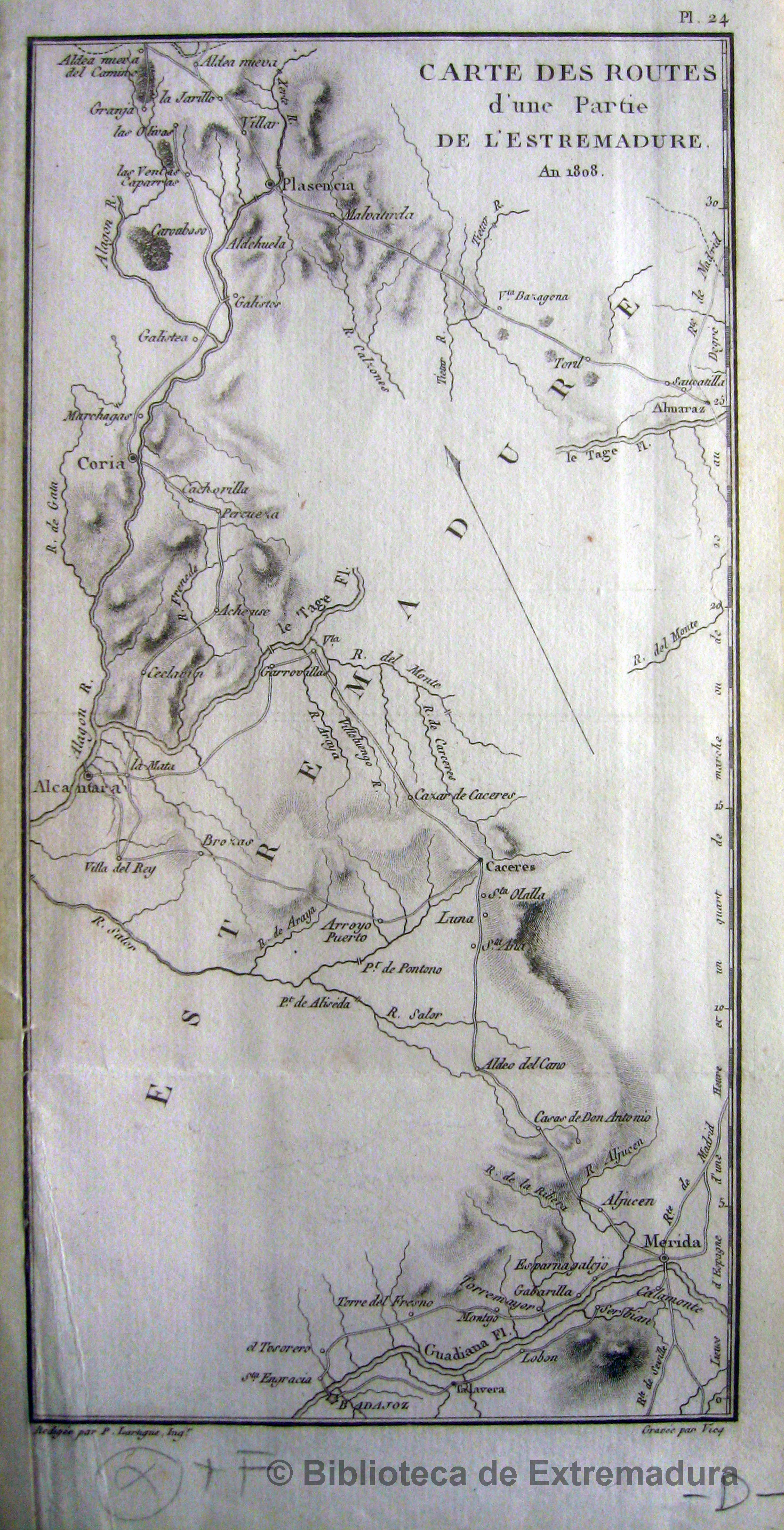 NOTAS En el ángulo superior derecho : ”Pl. 24”. – En: Laborde, Alexandre de. ´Atlas de L´Itineraire Descriptif de L´Espagne´. – Orientado con flecha con el N. al NO. del mapa. – Relieve por normales y sombreado. – Red hidrográfica y de comunicaciones. – Poblaciones representadas por círculos según su importancia. – Datos de la publicación sacados de la obra en la que se incluye. |