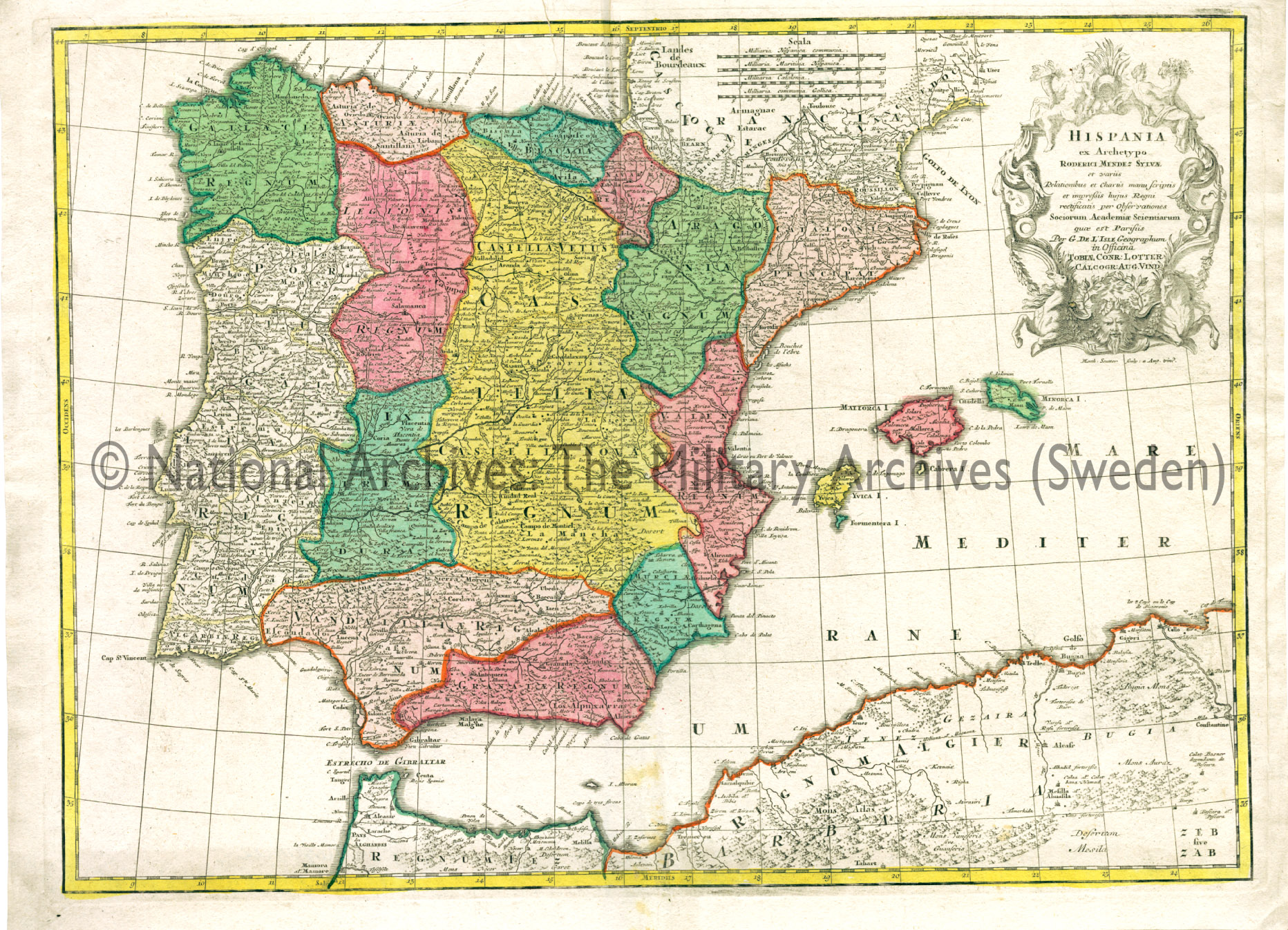 NOTAS Escala expresada también en otras unidades. – Toponimia en español y latín. – Orientado. – Relieve por montes de perfil y sombreado. – Márgenes graduados. Dibujados meridianos y paralelos formando cuadrícula. – Red hidrográfica. – Toponimia en español y latín. – Ciudades representadas por conjuntos de edificaciones según su importancia. – Divisiones administrativas diferenciadas por color. – Citado en ´Cartografía peninsular´, I. Colomer, 1992, p. 106, n. 351, donde figura como variante II, del mapa publicado en Amsterdam por Math. Seutter hacia 1744. Ambos mapas son copia del publicado por G. de L´Isle en 1701 (cat. n. 43). – Datos de publicación tomados de la obra en la que se incluye. – En el margen superior derecho cartela del título en cornucopia decorada con figuras alegóricas y caballos. En la parte inferior de la cartela figura la siguiente inscripción: ´Matth. Seutter sculp. a Aug. vind.' |