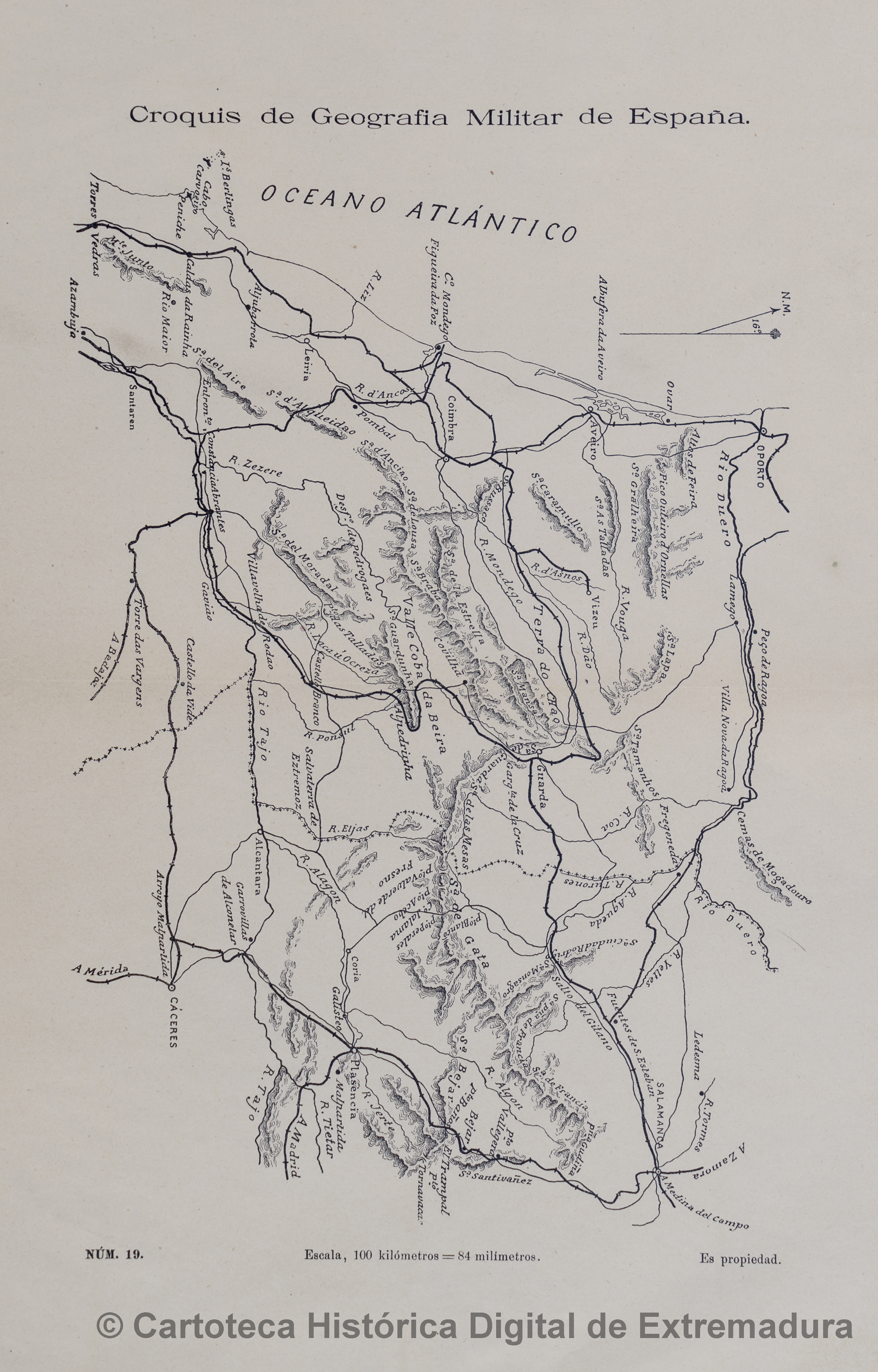 NOTAS Representa la zona comprendida entre Lisboa, Provincia de Cáceres, Provincia de Salamanca y Oporto. – En esquina inferior derecha: 'Es propiedad'. – En margen derecho: Escala 100 km= 84 mm. – Red de caminos. comunicaciones e hidrografía. – Relieve por sombreado. – Orientado con flecha |