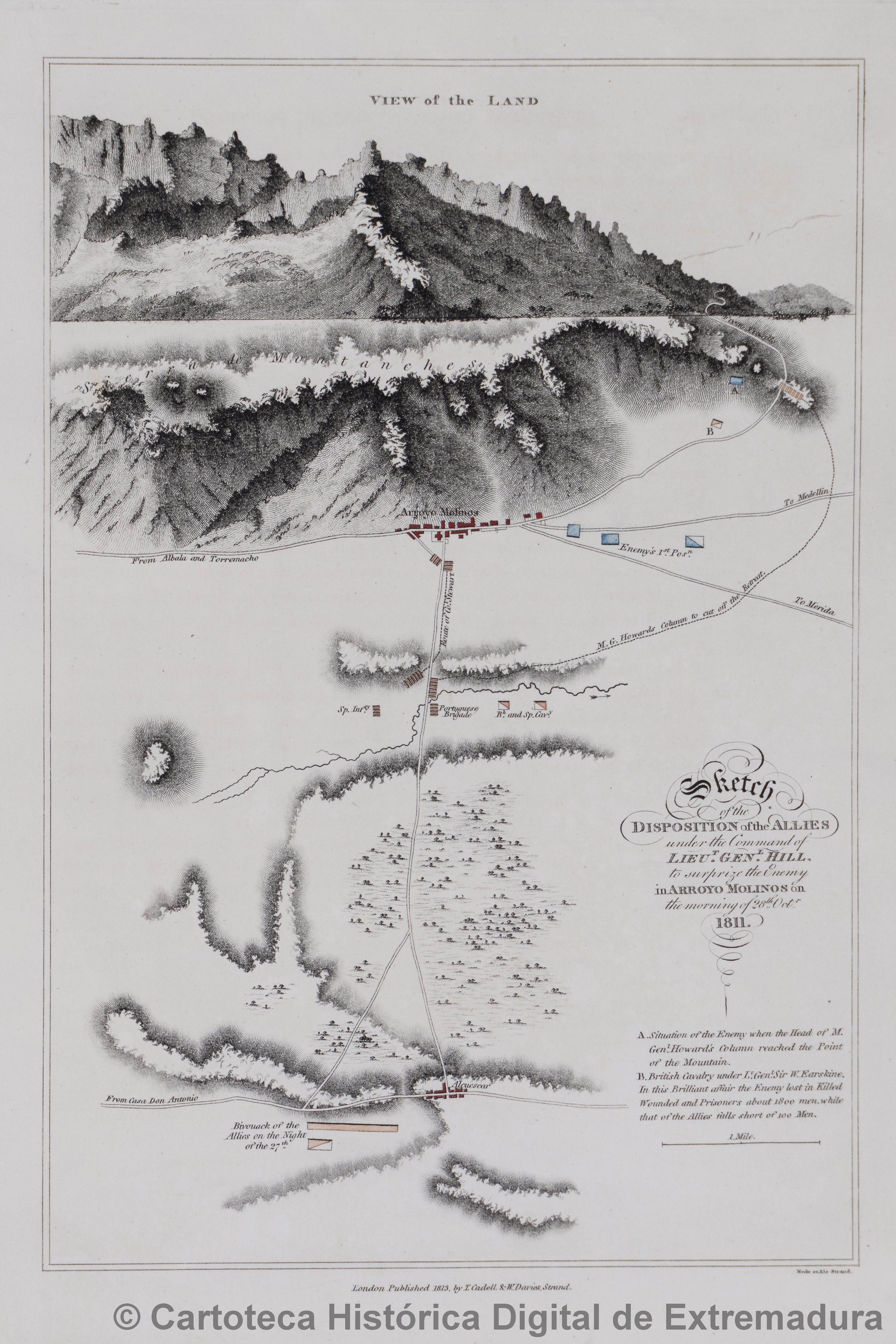 NOTAS En la parte superior aparece un perfil del terreno donde se desarrolló la batalla de Arroyomolinos de Montánchez en 1811. – Relieve por sombreado. – Red hidrográfica y de caminos. - Clave alfabética de la explicación de la situación de los enemigos en la batalla y la caballería inglesa. - Arbolado. – Decoración en la parte superior del título con elementos tipográficos. |