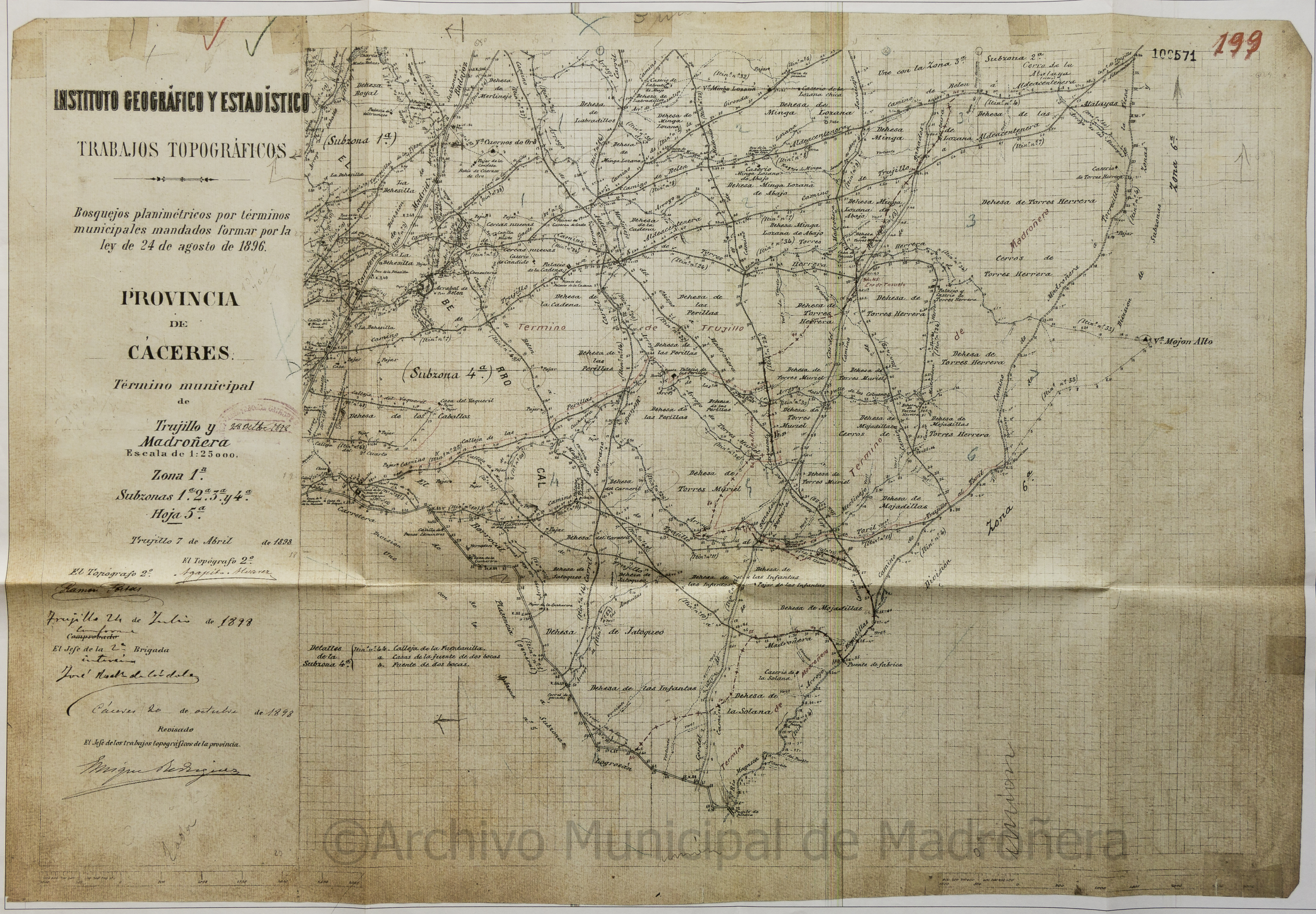 NOTAS Representación de los términos municipales de Trujillo y Madroñera, red de caminos, hidrografía, límites administrativos y puntos kilométricos y distancias. – Abundante toponimia. – Bosquejos planimétricos por términos municipales mandados formar por la Ley de 24 de agosto de 1896. – Fotocopia del original. – El documento original se encuentra en los Fondos Cartográficos © Instituto Geográfico Nacional www.ign.es. – Fecha exacta del documento: 7 de abril de 1898; fecha de comprobación: 24 de julio de 1898; fecha de revisión: 20 de octubre de 1898. – Incluye notas explicativas |