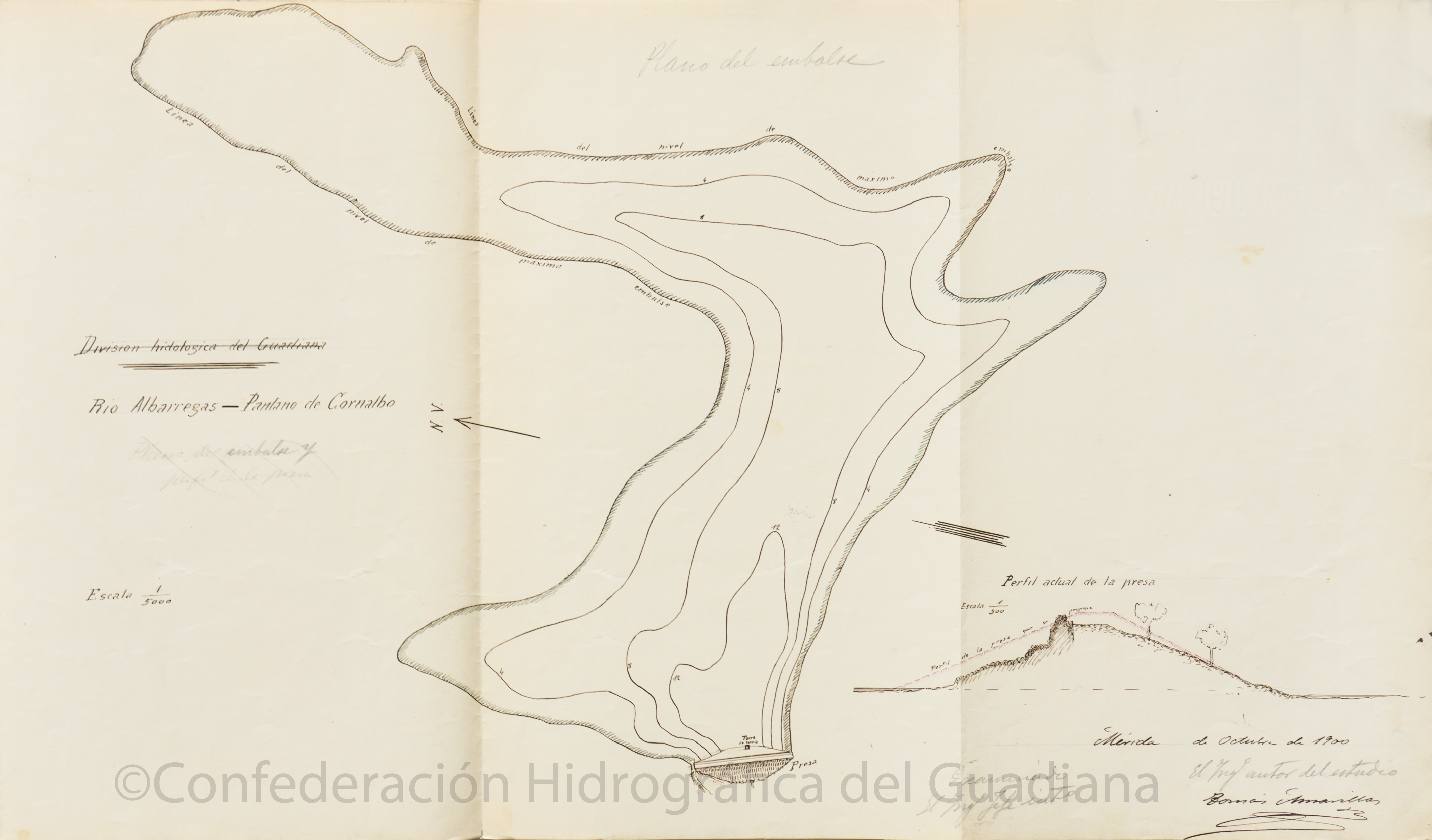 NOTAS Representación del pantano de Cornalvo, su perímetro, cuenca y presa. – Orientado con flecha. – Incluye croquis del perfil de la presa. – Incluye notas manuscritas. – Extraído de la propuesta nº 47 de pantanos para incluir en el Plan General de Canales de Riego y Pantanos de 1902. – Fecha exacta del documento: Octubre de 1900 |