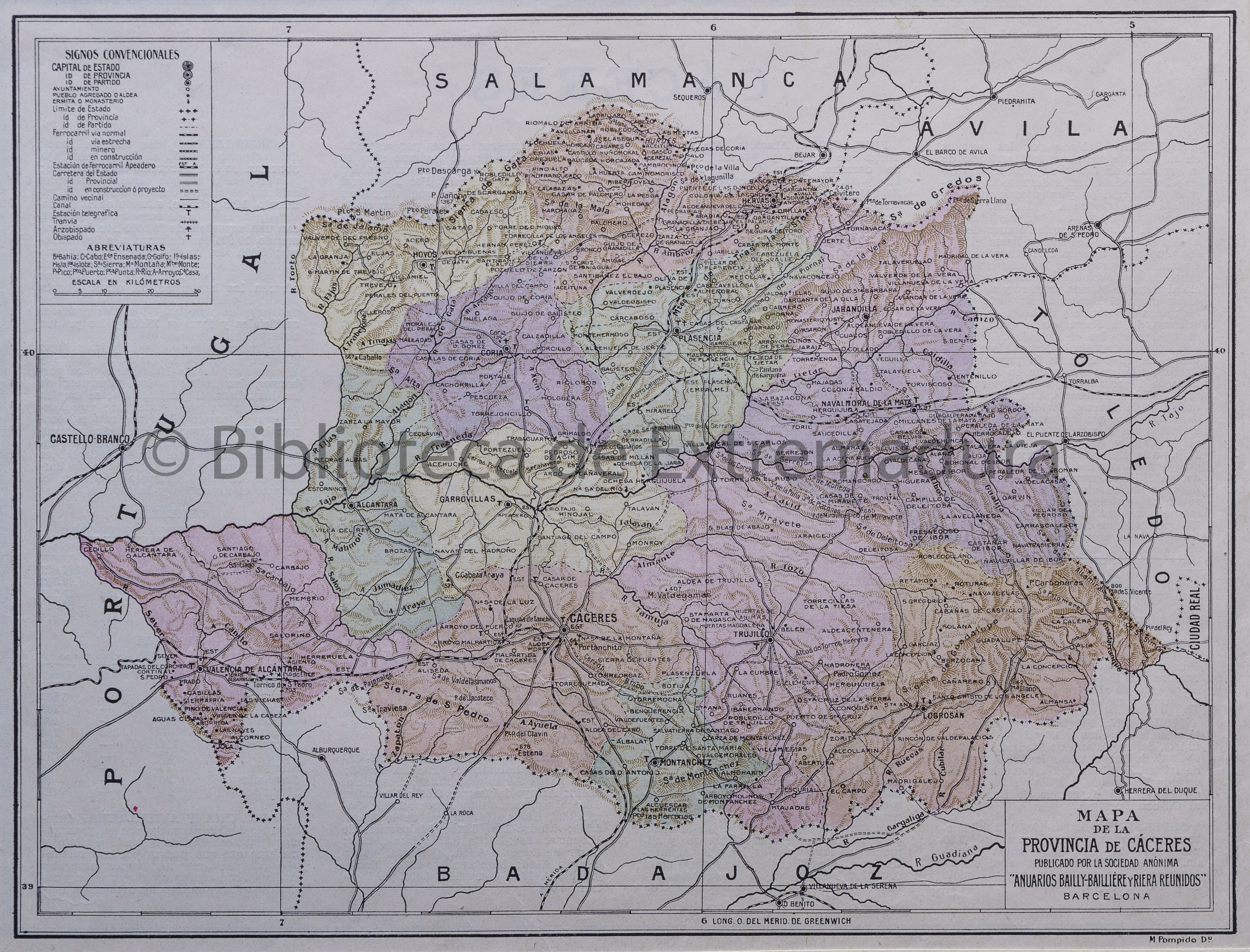 NOTAS Al verso: Texto impreso con la descripción de la provincia de Cáceres. – Relieve por sombreado. – Márgenes graduados. – Meridiano de origen, Greenwich. – Red hidrográfica. - Clave de símbolos indicando: capital de estado, de provincia y partidos, ayuntamientos, pueblos agregados o aldea, límites estatales, provinciales y de partido, ferrocarriles, carreteras, caminos, canales, estación telegráfica, etc. – Anotación manuscrita con la relación de los partidos judiciales de la provincia de Badajoz y el número de ayuntamientos. – La fecha del documento ha sido extraída de la catalogación de la Biblioteca Nacional |