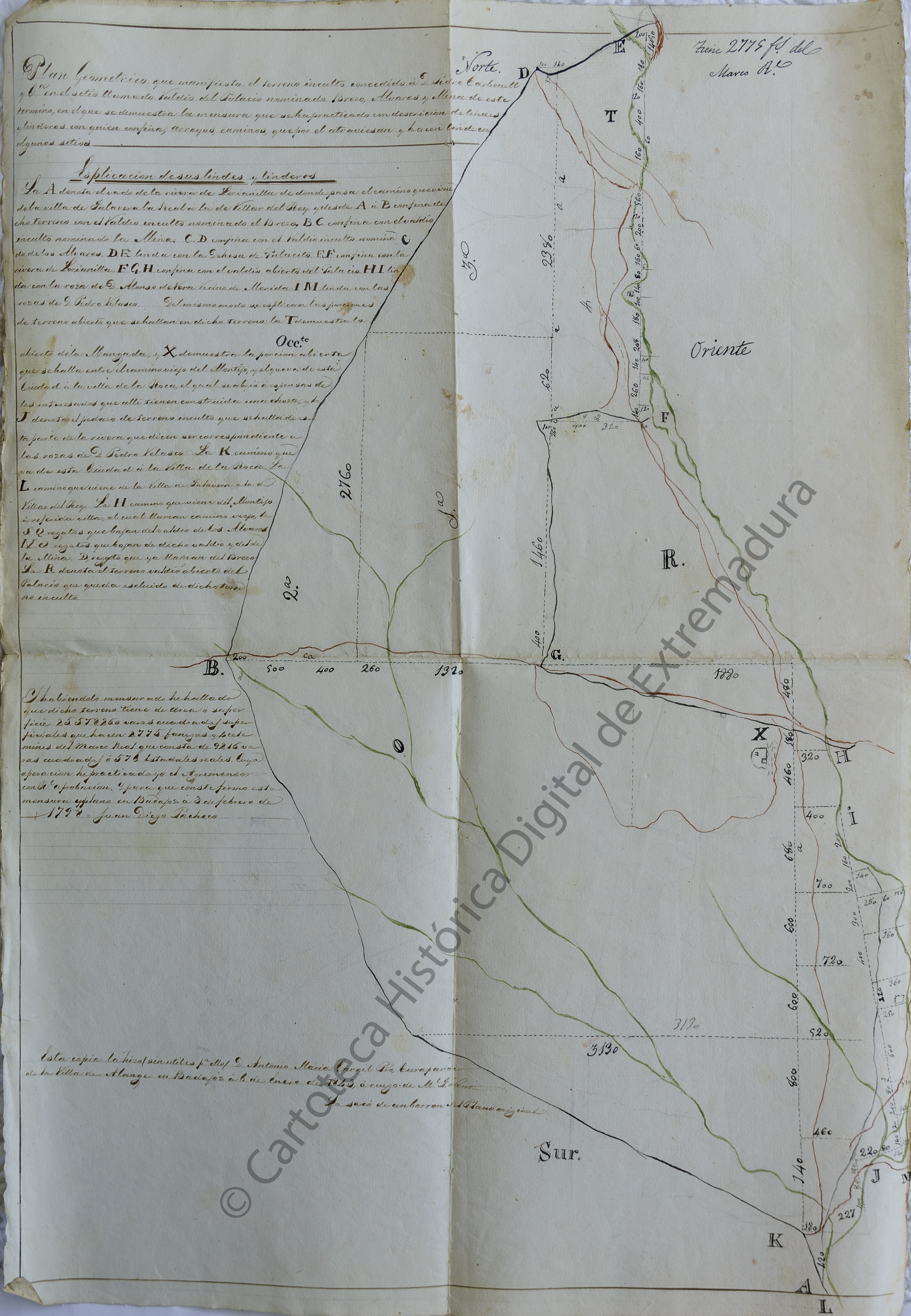 NOTAS Incluye leyenda con clave alfabética, declaración de lindes y linderos y notas manuscritas sobre el área que abarca la finca. – Incluye nota: 'Esta copia la hizo sin útiles D. Antonio María Carril Pro…'. – Nota al verso. – Incluye filigrana: 'RRS & FRF'. – Incluye otro mapa en el reverso. – Representación de las dimensiones y medidas de los terrenos concedido a D. Pedro Carbonell y Compañía, en el sitio llamado Valdío del Palacio nominado Brezos, Alvaros y Minas, incluyendo la red de caminos e hidrografía. – Extraído de las escrituras de dación de un trozo de terreno para incorporarlo a las propiedades de Josef Tomas Carvonel. – Mapa original elaborado por Juan Diego Pacheco en 1798 y copiado por Antonio María Carril Pro en 1843. –Orientado al Norte. |