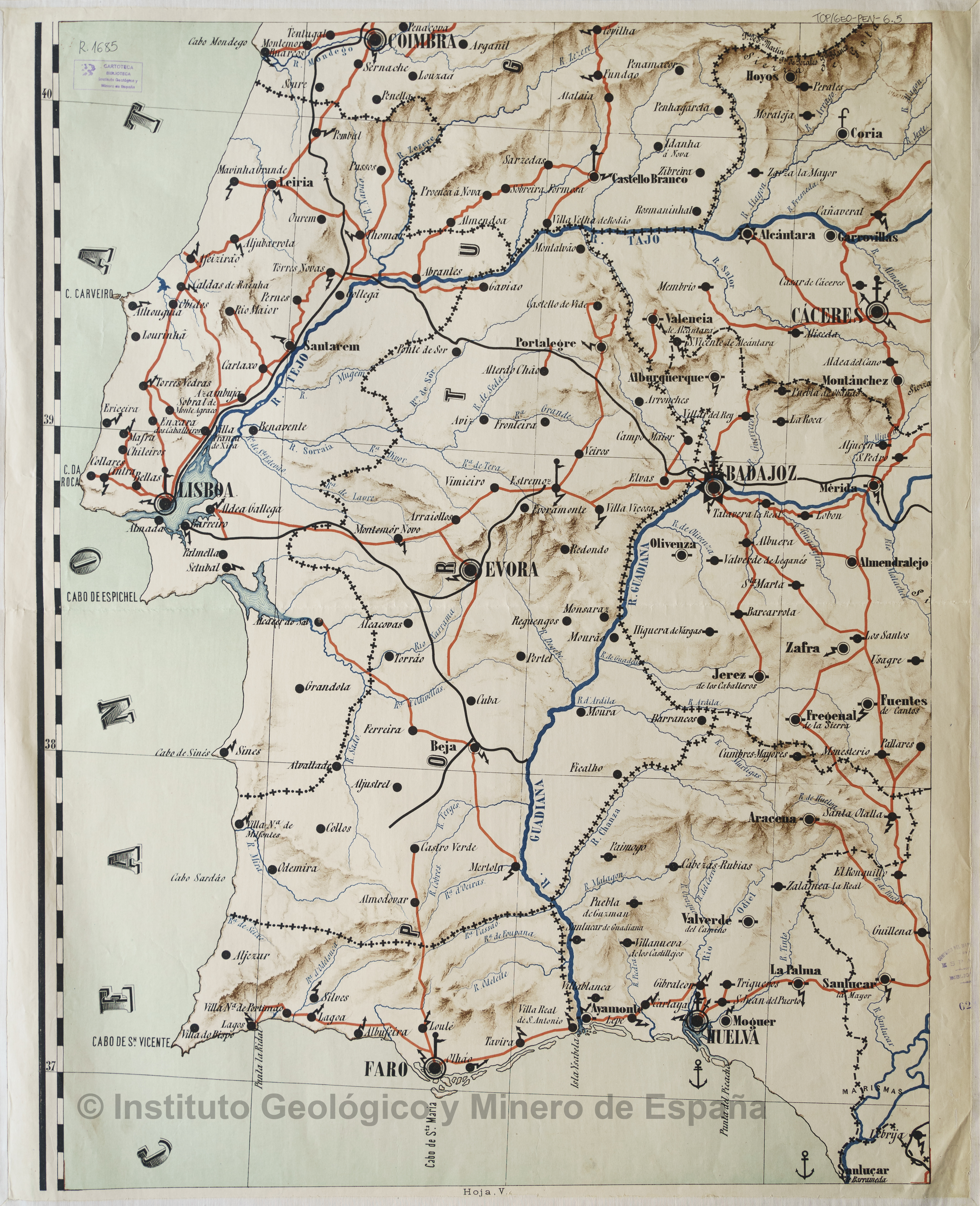 NOTAS Representa la zona comprendida entre Cáceres, Badajoz, Huelva, Lisboa, Evora, Faro y Coimbra. – Márgenes graduados. – Red hidrográfica y de caminos. – La hoja VIII inserta mapa director o mapa general. – Divisiones administrativas. – Relieve por sombreado. – Abundante toponimia. – Ciudades representadas según su importancia mediante círculos. |