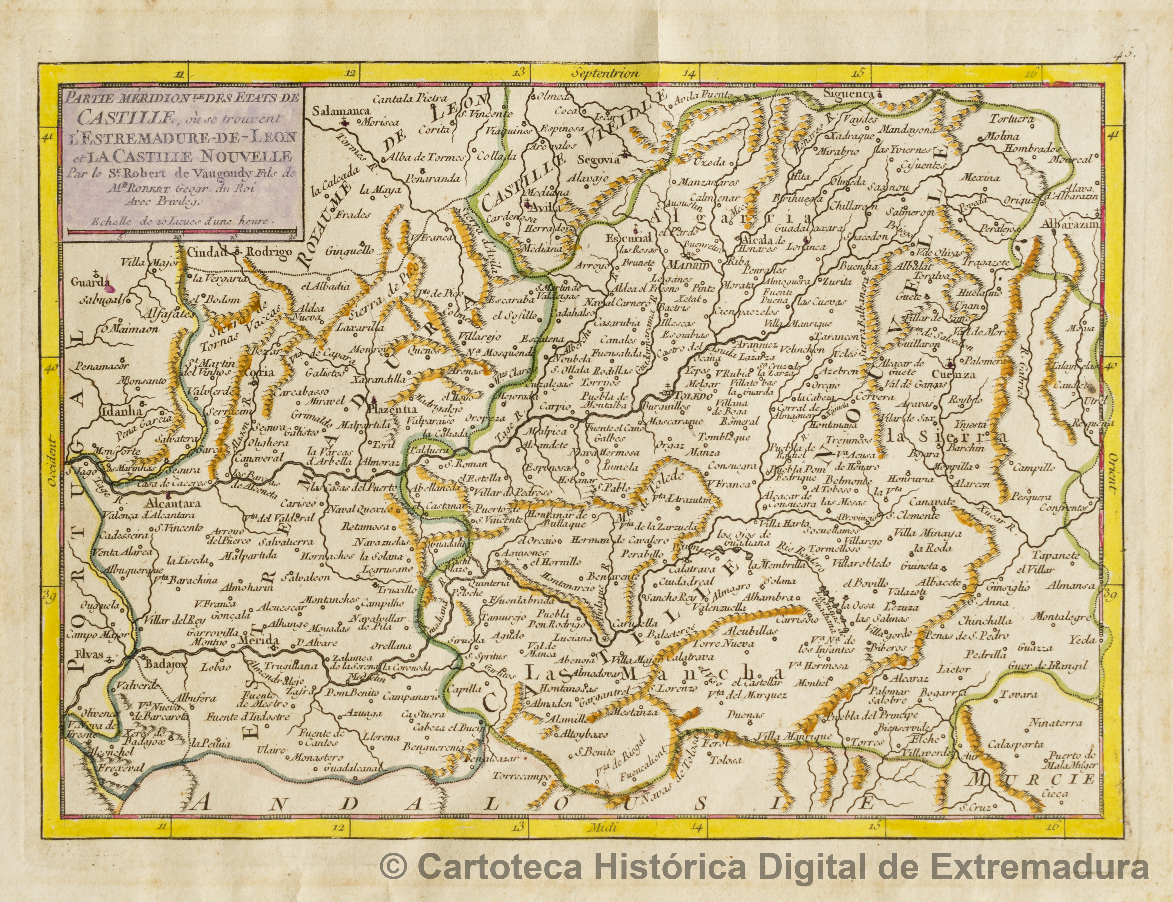 NOTAS En: Robert de Vaugondy, Didier. “Atlas Portatif Universel”. – Abundante toponimia. – Orientado. – Relieve por montes de perfil y sombreado. – Márgenes graduados. – Red hidrográfica. – Divisiones administrativas diferenciadas por líneas de color. – Ciudades representadas por pequeños círculos o por conjuntos de edificaciones según su importancia. – Datos de publicación tomados de la obra en la que se incluyó el mapa. –Coloreadas a mano las cadenas montañosas y la delimitación de los reinos |