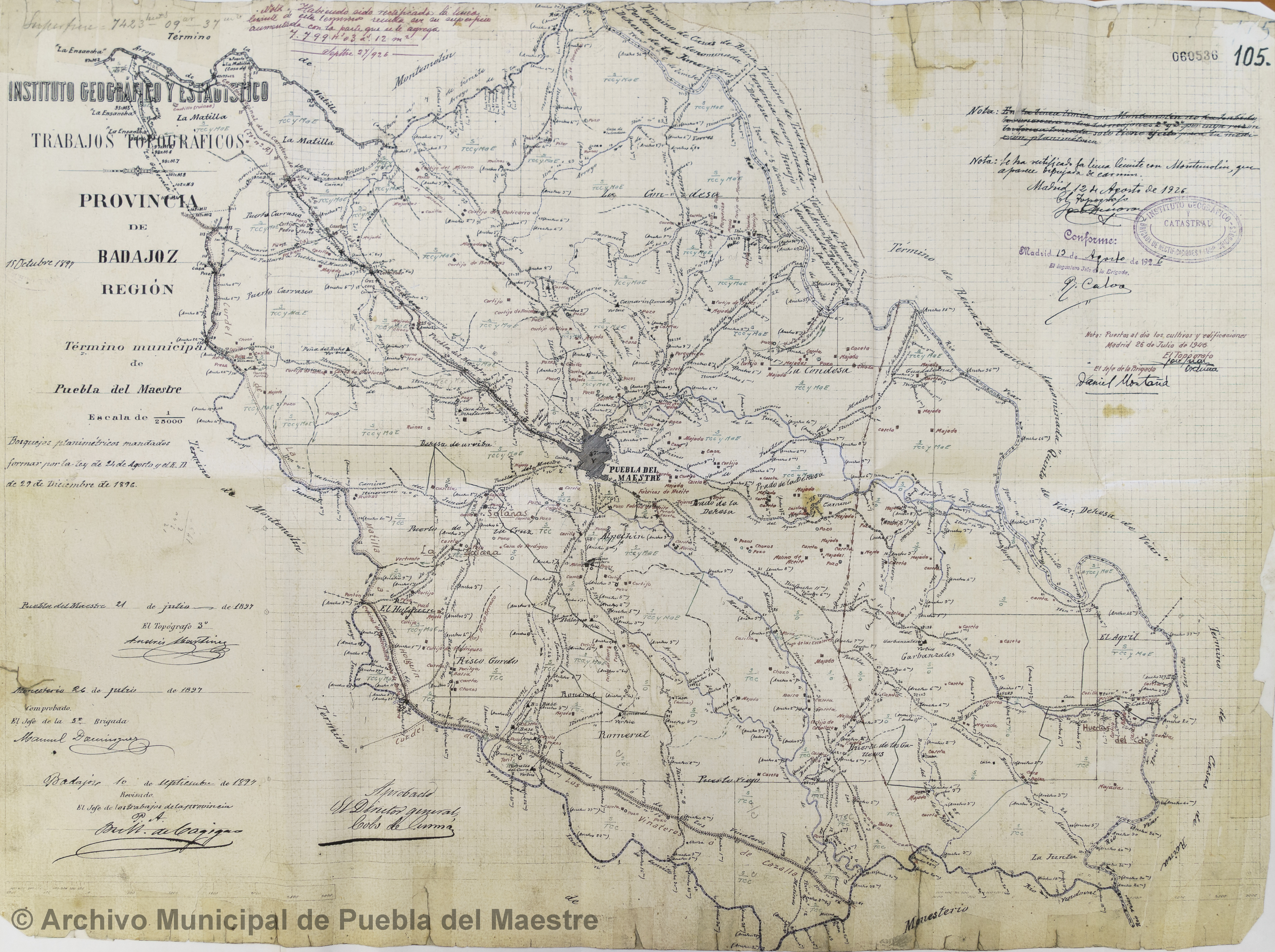 NOTAS Representación del municipio de Puebla del Maestre incluyendo la red de caminos e hidrografía. – Bosquejos planimétricos mandados formar por la Ley de 24 de agosto y el R.D. de 29 de diciembre de 1896. – Abundante toponimia. – Incluye notas manuscritas sobre rectificación de datos a fecha de 1926 y sello de conformidad sobre dicha rectificación por el ingeniero jefe de la brigada B. Calvo. – El documento original se encuentra en los Fondos Cartográficos © Instituto Geográfico Nacional www.ign.es. – Fecha exacta del documento: Puebla del Maestre, 21 de julio de 1897; fecha de comprobación: Monesterio, 26 de julio de 1898; fecha de revisión: Badajoz, 10 de septiembre de 1897. |