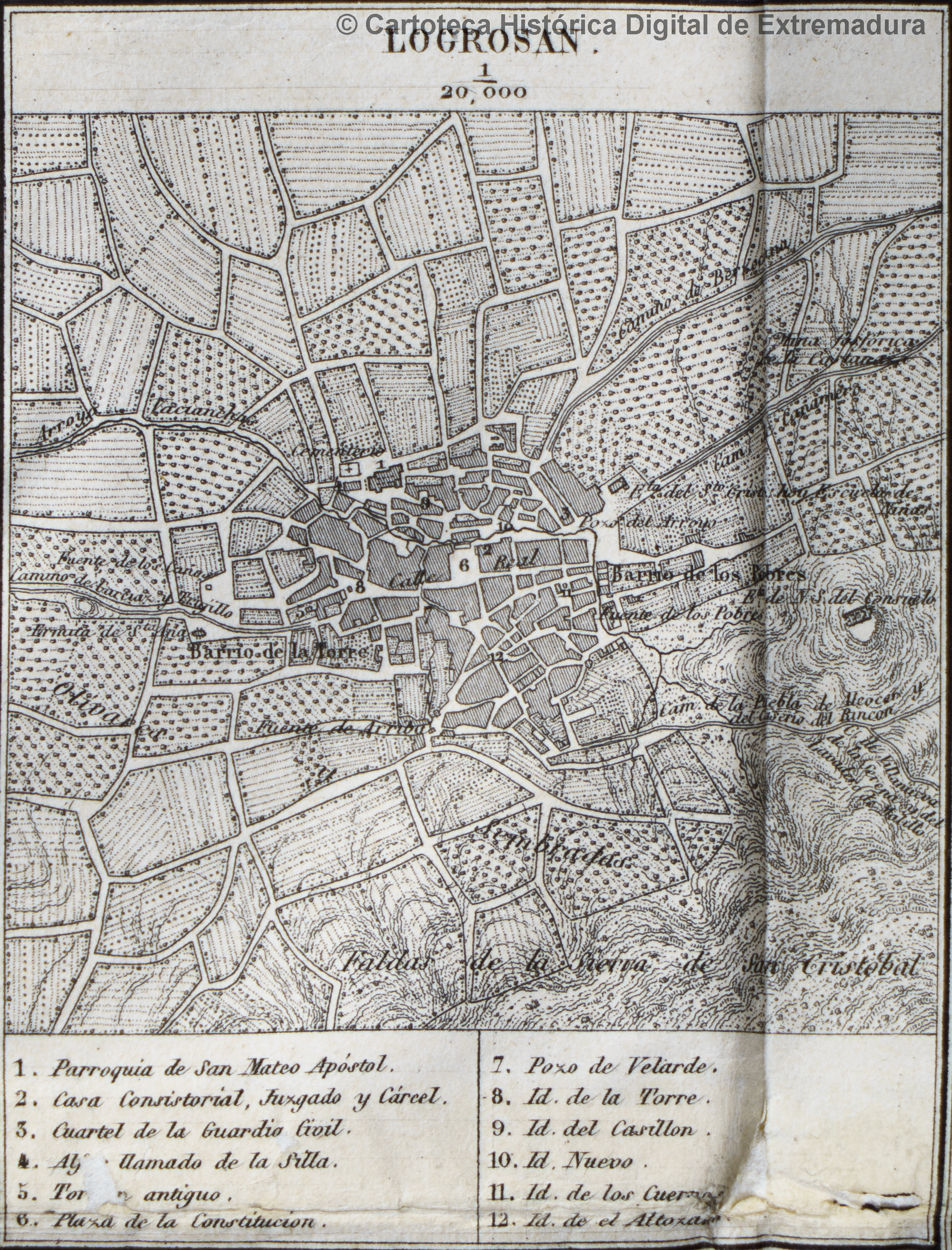 NOTAS Clave alfanumérica con los edificios eclesiásticos y civiles más importantes como las parroquias, ermitas, conventos, la cárcel Ayuntamiento y alhóndiga, Audiencia eclesiástica, etc. – Abarca la ciudad de Logrosán y alrededores. - En: Coello y Quesada, Francisco. “Atlas de España y sus posesiones de Ultramar. Cuarta hoja de suplemento: León y Extremadura”, 1840-1870. - Relieve por normales y sombreado. – Red hidrográfica y de caminos. - Arbolado y cultivos representados. – Datos de la publicación sacados de la obra en la que se incluye |