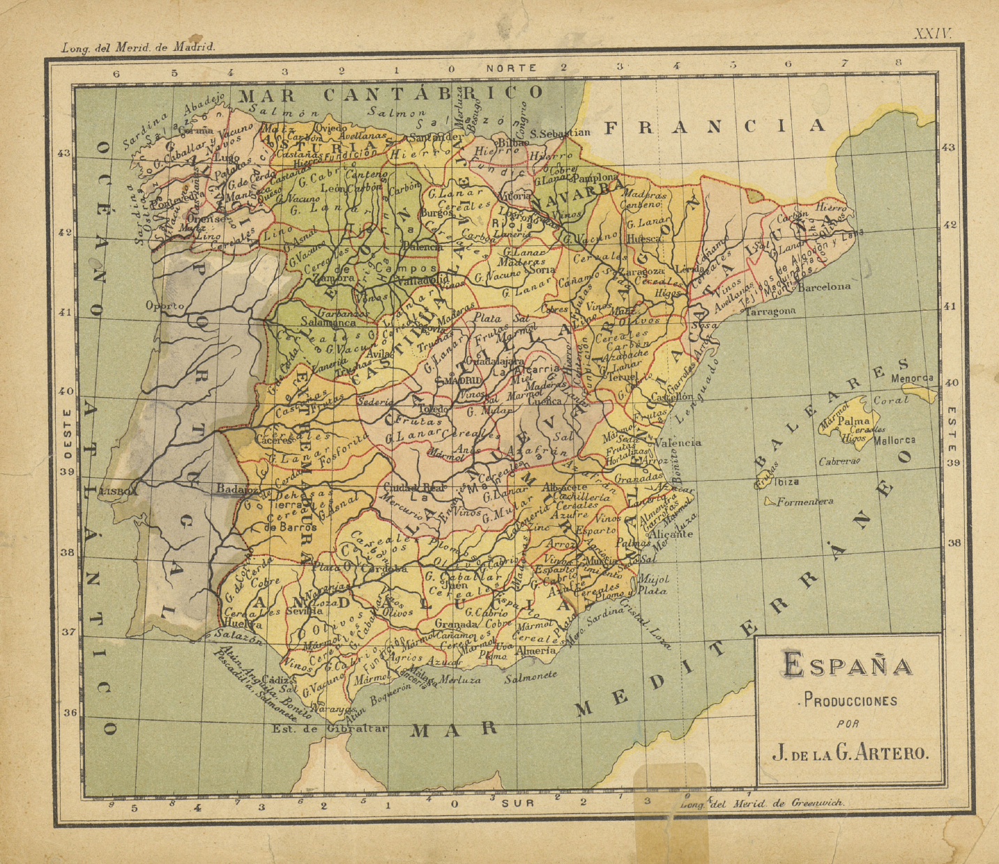 NOTAS Indica el tipo de producción del país (hortofrutícolas, minerales, animales, …). – Marco graduado, meridianos y paralelos formando cuadrícula. – Toponimia en español. – División administrativa en color. – Longitud del Merid. de Madrid; Longitud del Merid. de Greenwich. – Red hidrográfica. – En margen superior derecho: XXIV. – En: `Atlas de Geografía : Astronómica, Física, Política y Descriptiva para uso de los establecimientos de segunda enseñanza` / D. Juan de la G. Artero, catedrático de la Universidad de Barcelona y académico correspondiente de la de la Historia ; grabado por Juan Soler. 1911 |