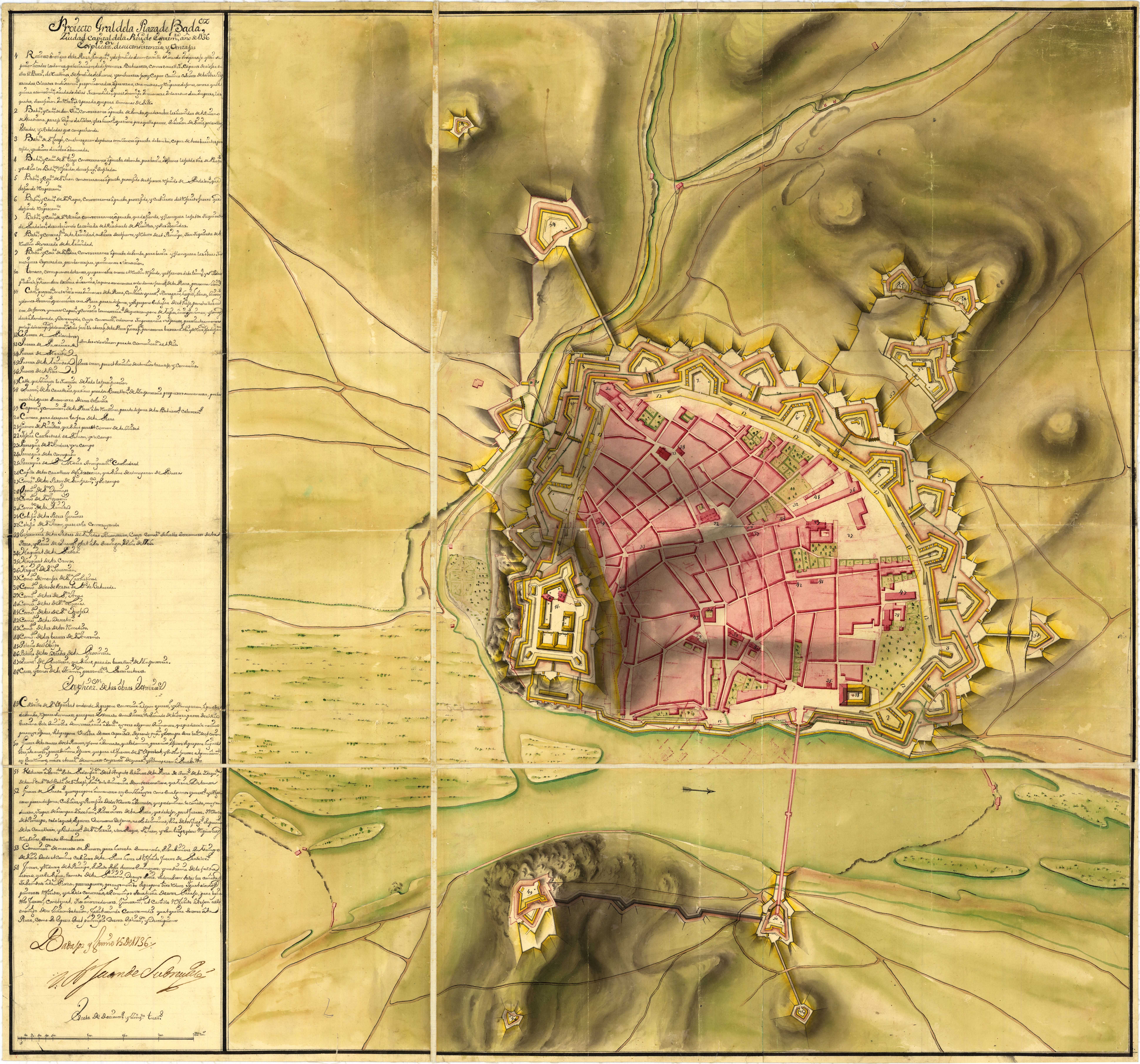 NOTAS Presenta el proyecto de la plaza y sus defensas. – Manuscrito firmado, rubricado y fechado en Badajoz. – Relieve representado por sombreado. – Manuscrito a plumilla en tintas negra y roja y coloreado a la acuarela en varios colores. – Relación de las baterías, puertas, conventos etc. indicada mediante clave numérica. – Indica la dirección del río con flecha. – Entelado en 4 cuarterones |