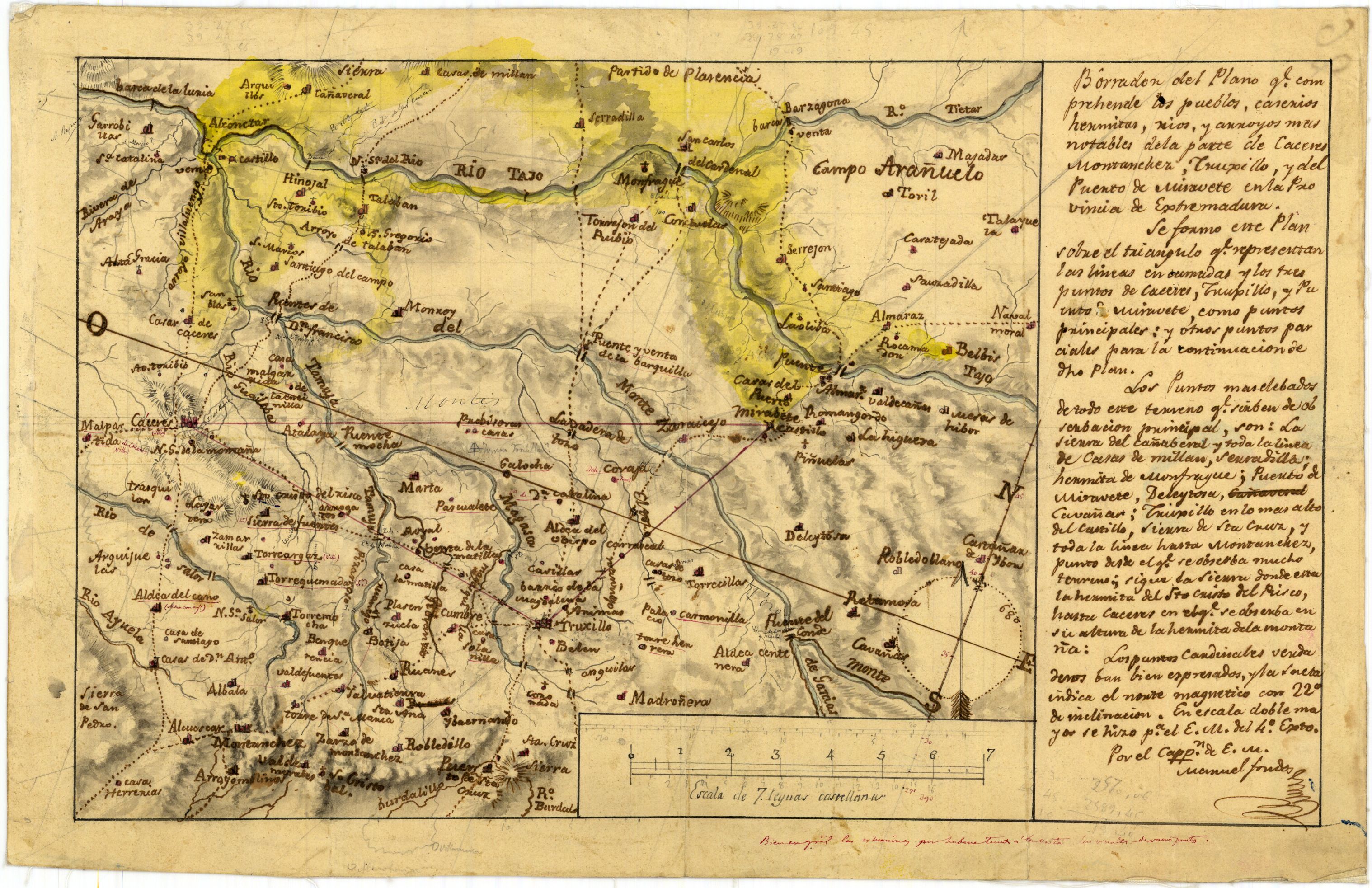 NOTAS Manuscrito firmado y rubricado. – Orientado con flecha. – Relieve representado por sombreado. – Manuscrito a plumilla en tinta negra y coloreado a la acuarela en varios colores. – Nota relativa a la composición del mapa: '... se formó sobre el triangulo que representan las lineas en... y los tres puntos de Cáceres, Truxillo y Puente de Miravete...' . – En el margen inferior: 'Bien en grál. las situaciones por haber tenido a la vista las visuales de varios puntos' |