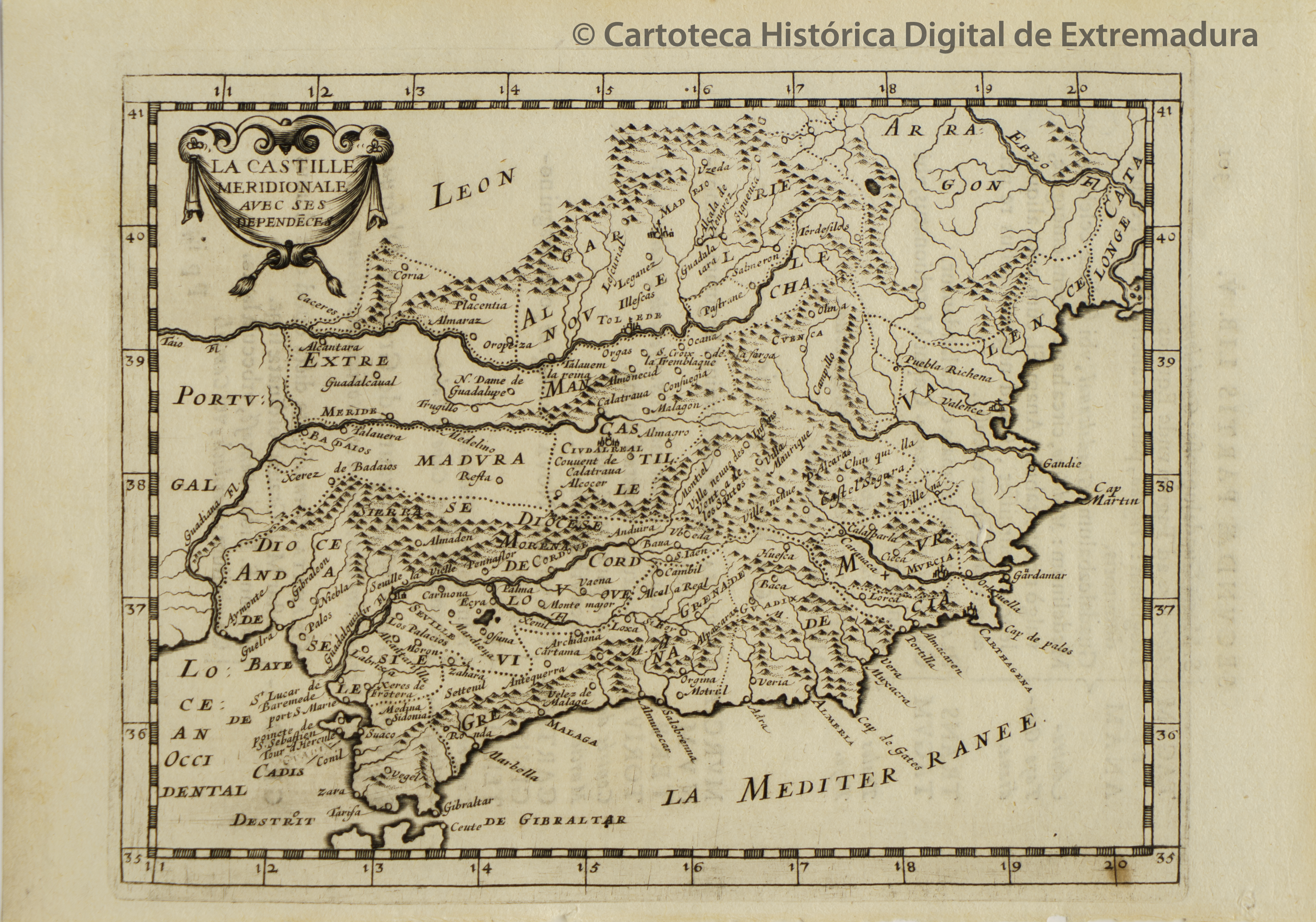 NOTAS Abarca las provincias de Andalucía, Murcia, Valencia, Extremadura y Castilla La Mancha con detalle, y someramente las Provincias de León, Aragón y el Este de Portugal. - Abundante toponimia. - En: Briet, Phillippe. “Theatre Geographique de l´Europe… “. - Relieve por montes de perfil y sombreado. - Márgenes graduados. – Red hidrográfica. Costas sombreadas. - Divisiones administrativas por punteado. – Representa las ciudades con planos de población según su importancia. – Muestra las ciudades religiosas con cruz. - Datos de la edición sacados de la obra en la que se incluye. - Título en cartela decorativa en tela |
