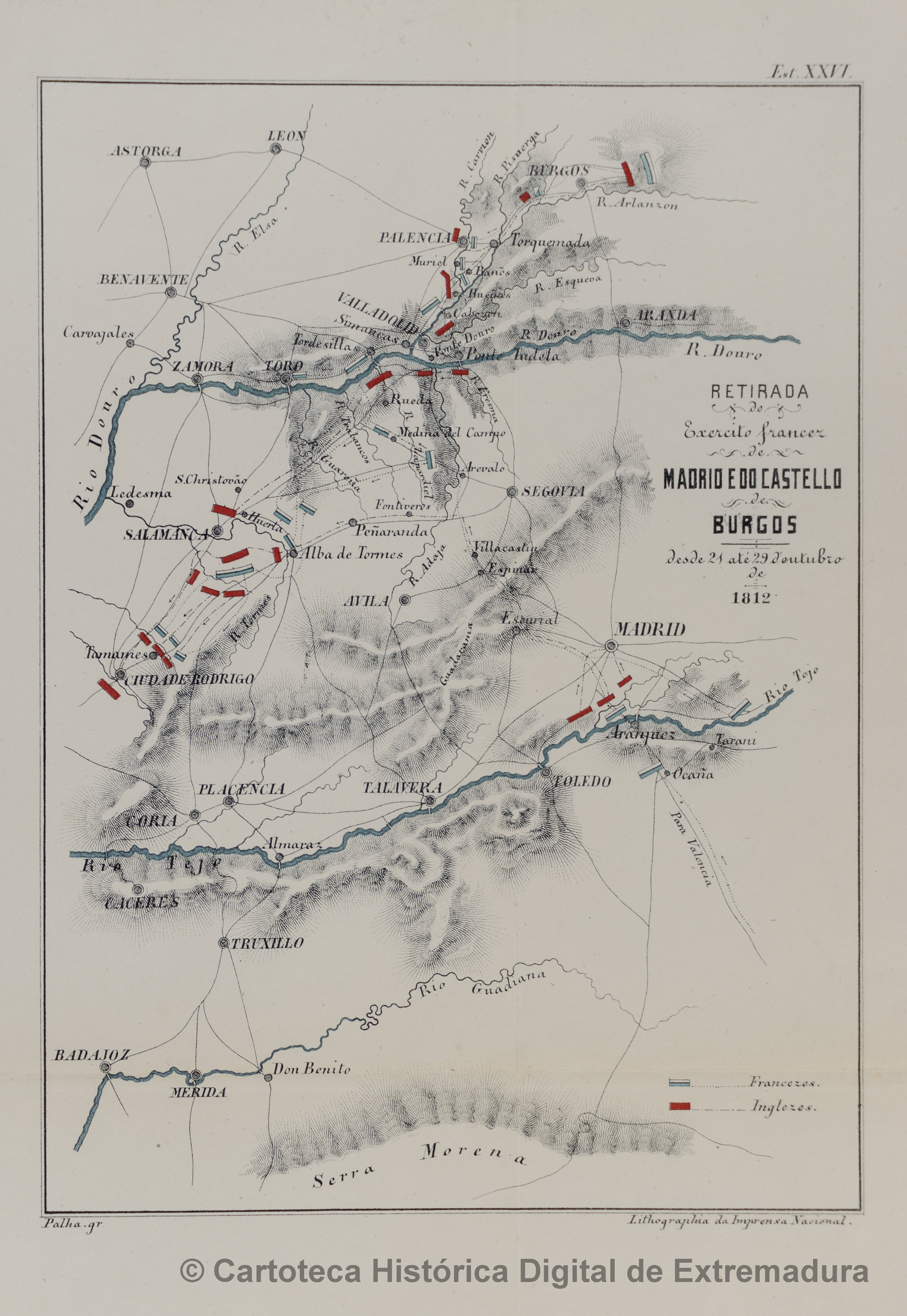 NOTAS En el margen superior derecho: ”Est. XXVI”. – En el margen inferior izquierdo: ”Palha gr.”. - En el margen inferior derecho: “Lithographia da Imprença Nacional”. - Abarca las actuales provincias de León, Burgos, Segovia, Zamora, Salamanca, Valladolid, Madrid, Toledo, Cáceres y Badajoz. - Representa las posiciones de retirada del ejército francés después de la batalla de los Arapiles de Madrid y de Burgos desde el 21 al 29 de Octubre de 1812. – En: Luz Soriano, Simão José da. “História da Guerra Civil e do estabelecimento do governo parlamentar em Portugal comprehendendo a história diplomática militar e política d´este reino desde 1777 até 1834”, 1866-1890. vol. 19, tomo VII.- Relieve por normales y sombreado. – Red hidrográfica y de comunicaciones. – Clave alfabética en color identificando los ejércitos franceses e ingleses. – Indica mediante círculos las ciudades según su importancia. – Título decorado con caracteres tipográficos |