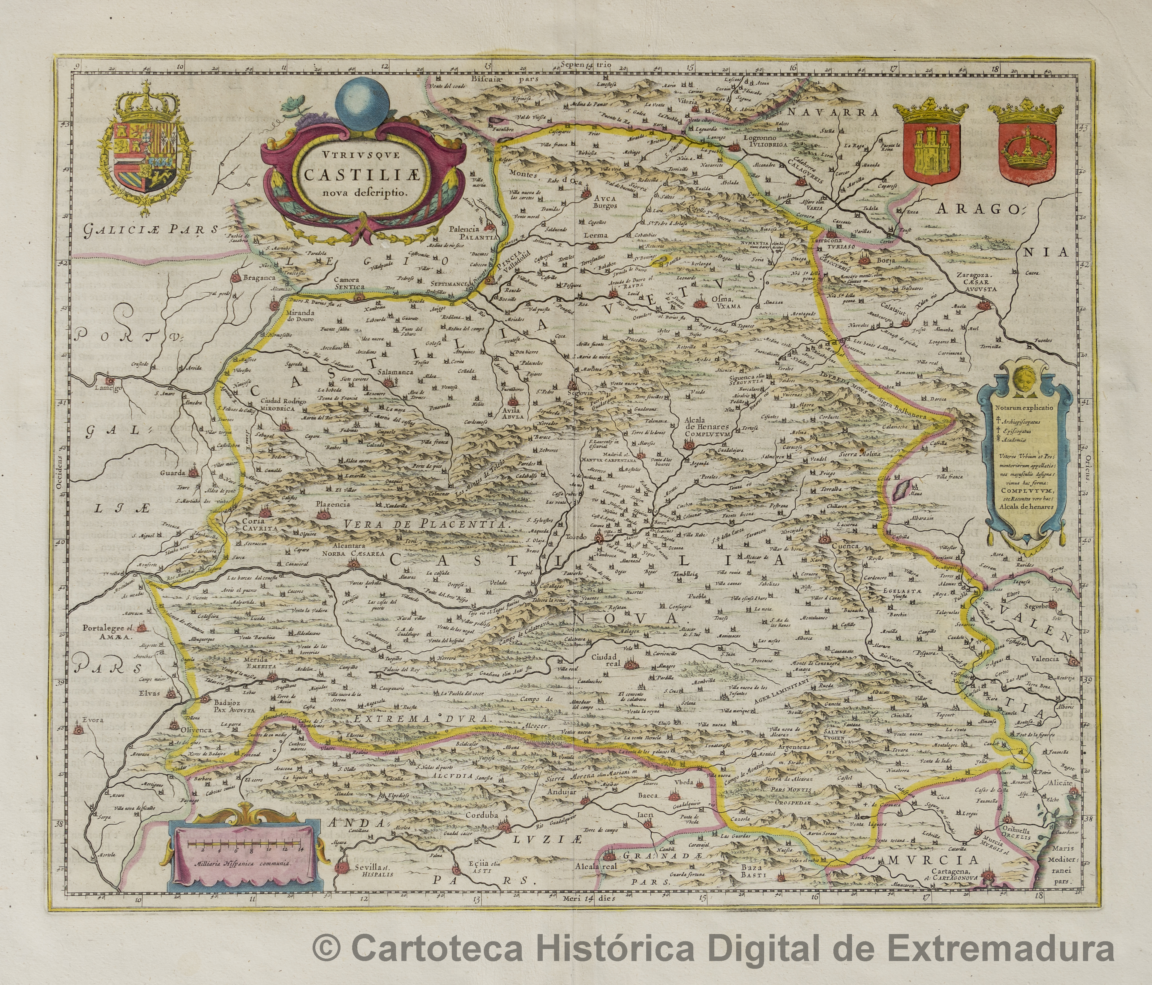 NOTAS Difiere de otros ejemplares similares en el título y el texto del reverso. – Clave de símbolos en cornucopia. – Al verso incluye amplia descripción geográfica del contenido en holandés. – En: Blaeu, J. 'Grooten Atlas, oft Werelt-Beschryving, in welcke ´t Aerdryck, de Zee, en Hemel, wort vertoont en beschreven', 1664. – Orientado. - Relieve por montes de perfil y sombreado. – Márgenes graduados. – Red hidrográfica y de comunicaciones. – Ciudades representadas por círculos y conjuntos de edificaciones según su importancia, indicando con cruces de un brazo los obispados y de doble brazo los arzobispados. Indicadas también las universidades. – En la parte superior escudo real, escudos de las dos Castillas y escala en cornucopia |