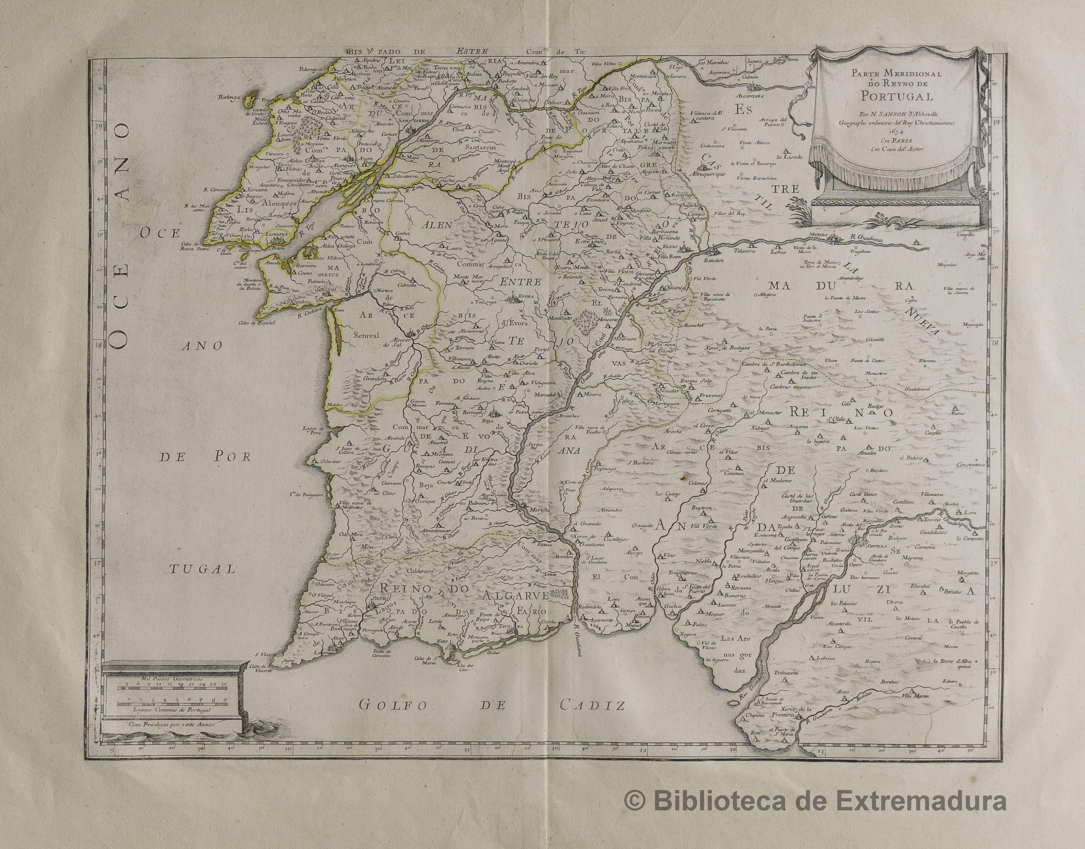 NOTAS En el margen inferior izquierdo escalas en placa de mármol sobre olas. – Al pie de las escalas : 'Cum privilegio por vinte Annos'. – Escala también en Miles de pasos geométricos. – Abarca también parte de Extremadura. – En: Sanson d´Abbeville , Nicolás. 'Cartes Generales de toutes les parties du Monde'. – Orientado. – Márgenes graduados. – Relieve por montes de perfil y sombreado. – Red hidrográfica y de caminos. Costas sombreadas con un pequeño rayado. Cabos y Golfos representados. – Ciudades representadas mediante planos según su importancia. – Delimitaciones administrativas por líneas de color. Arbolado. – Datos de la publicación sacados de la obra en la que se incluye el mapa. – Cartela sobre tela blasonada y elementos vegetales |