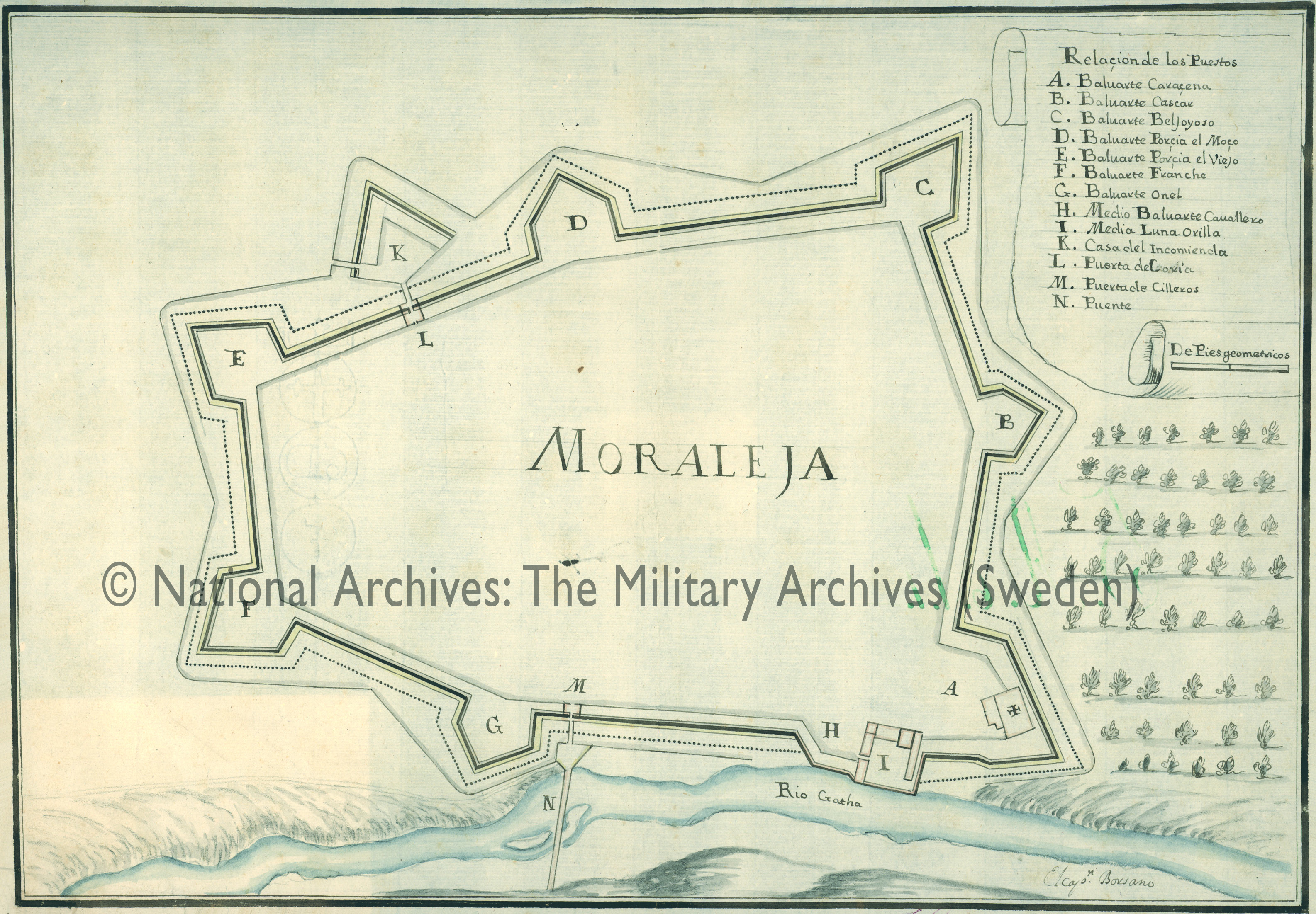 NOTAS Relieve por montes de perfil y sombreado. – Red hidrográfica. – Arbolado. – Inserta clave alfabética con la relación de los puestos y los baluartes y de las edificaciones defensivas importantes como el puente y otras edificaciones representativas como la iglesia. – Clave en forma de pergamino. – Manuscrito iluminado en gris y azul. |