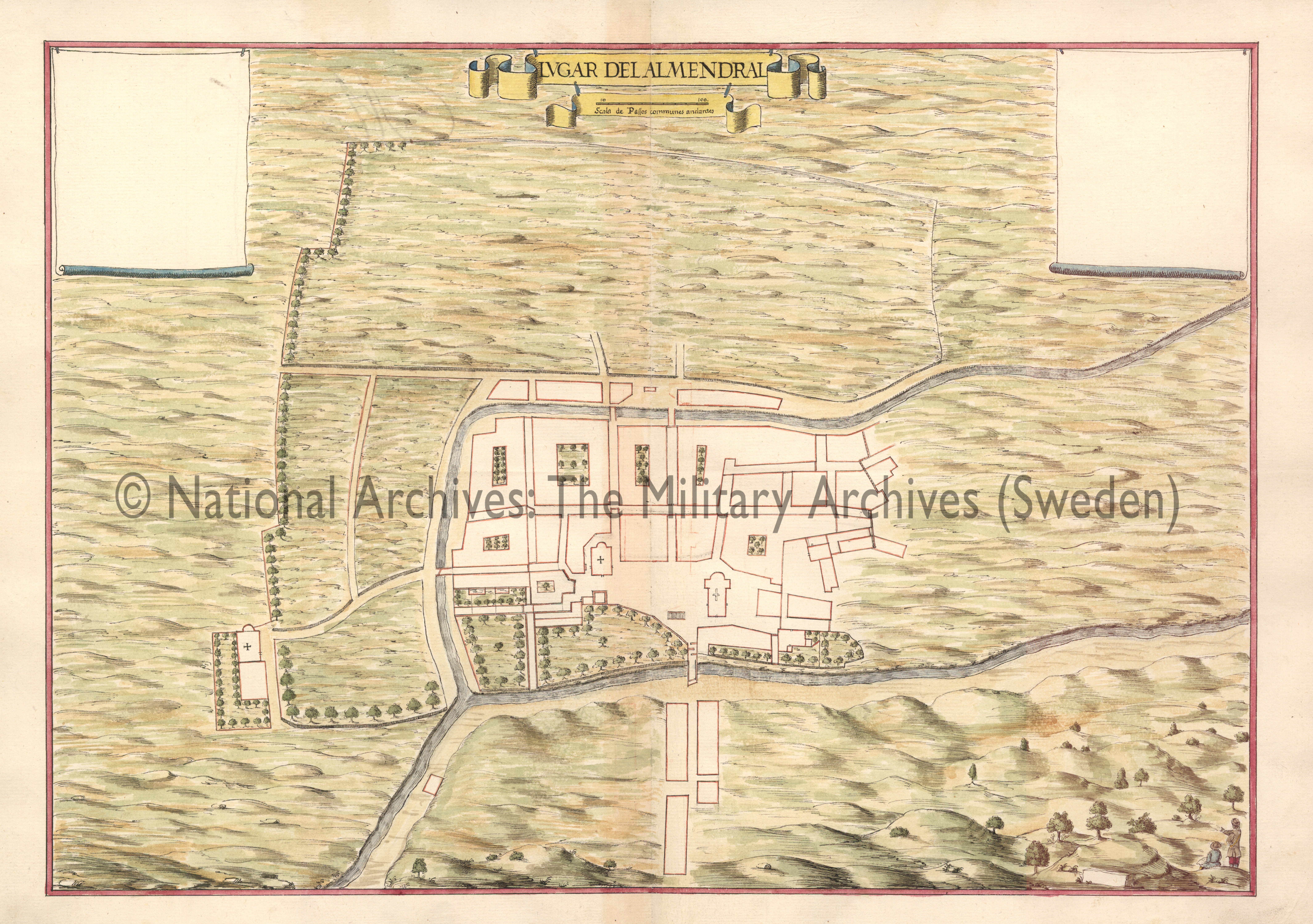 NOTAS Relieve por montes de perfil y sombreado. – Red hidrográfica. – Representa la ciudad de Almendral y sus edificios más representativos, como por ejemplo las iglesias y el cementerio. – Vegetación y cultivos. – Personas observando la ciudad desde un alto en el margen inferior derecho del mapa. – Manuscrito sobre papel iluminado en ocre, verde y sepia. – Claves en blanco a ambos lados del mapa |