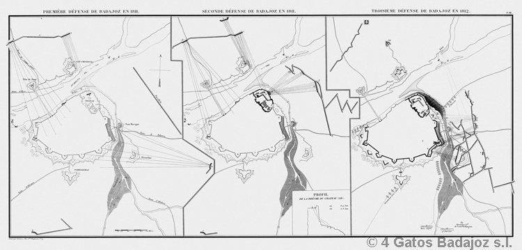 NOTAS Contiene: 1. Première défense de Badajoz en 1811 2. Seconde défense de Badajoz en 1811. – Inserta en el margen inferior derecho un perfil de la brecha del Castillo. 3. Troisième défense de Badajoz en 1812. – En el margen superior derecho: ”P. III”. – Los tres planos representan los asedios de las tropas aliadas luso– británicas contra Badajoz durante los años 1811 y 1812. Se muestran las obras de asedio y defensa y las posiciones de los ejércitos. – En: Lamare, Jean Baptiste Hypolite. ” Relation des siéges et défenses d´Olivença, de Badajoz, et de Campo– Mayor, en 1811 et 1812, par les troupes françaises de l´Armée du midi en Espagne”. – 2ª ed. – París: Anselin ,1837. – Orientado con flecha. – Red hidrográfica y de caminos. Indica con flecha la dirección de la corriente. – Datos de publicación tomados de la obra en la que se incluye |