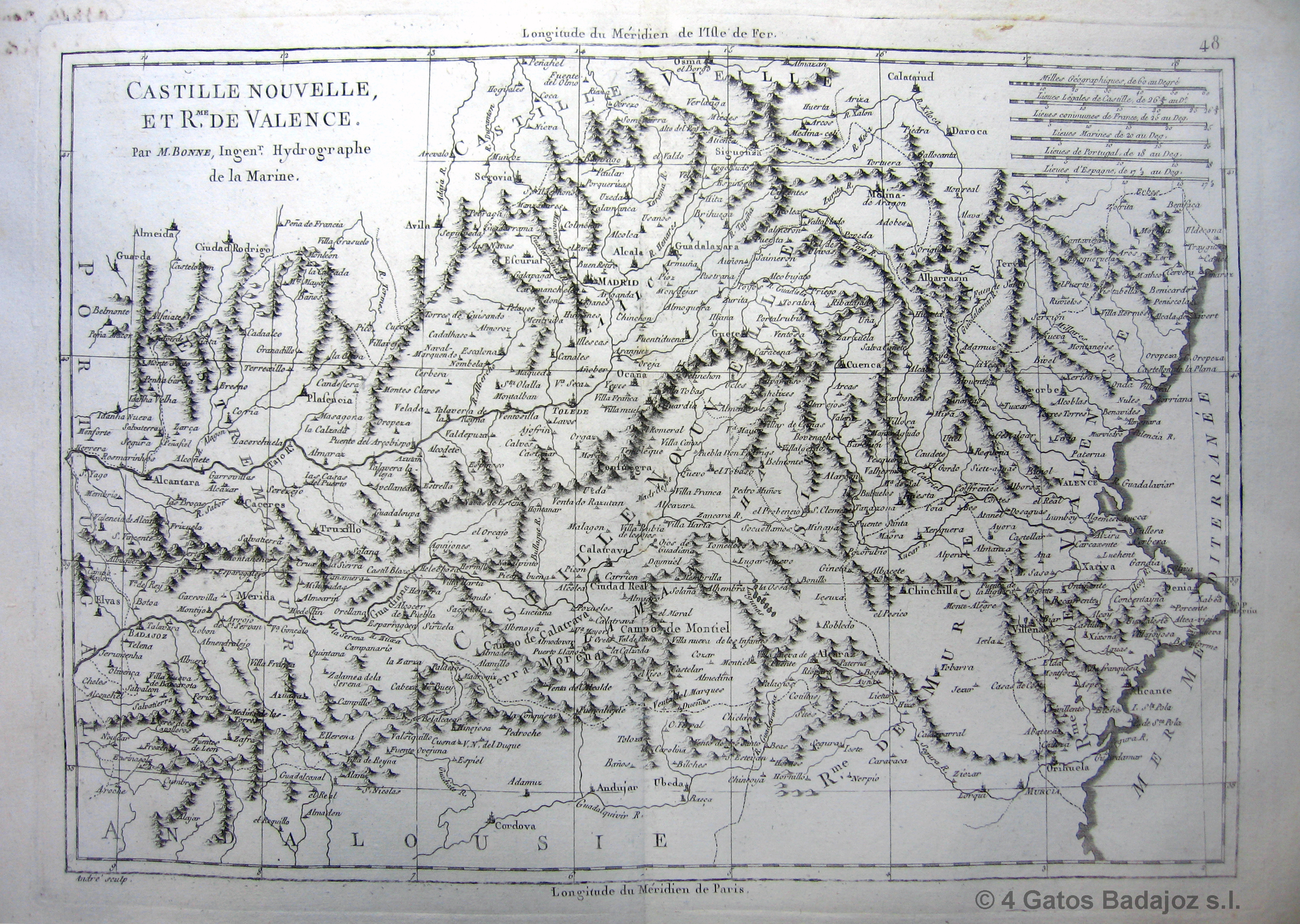 NOTAS En el margen superior derecho: ”48”. – Escala también en otras unidades. – Abarca las actuales provincias de Extremadura, Salamanca, Murcia, Valencia y el Norte de Andalucía. – En: Bonne, Rigobert y Desmarest, M. “Atlas Enciclopédique, contenant la Géographie Ancienne, et quelques cartes sur la Géographie du moyen age, la Géographie Moderne, et les cartes relatives a la géograpgie physique”, 1787. – Relieve por montes de perfil y sombreado. – Márgenes graduados. Red de meridianos y paralelos formando cuadrícula. Longitud del meridiano de la Isla de Hierro y de París – Red hidrográfica. Costas sombreadas por pequeño rayado. – Indica las divisiones administrativas por línea de puntos. – Representa mediante planos las ciudades según su importancia. – Datos del mapa sacados de la obra en la que se incluye |