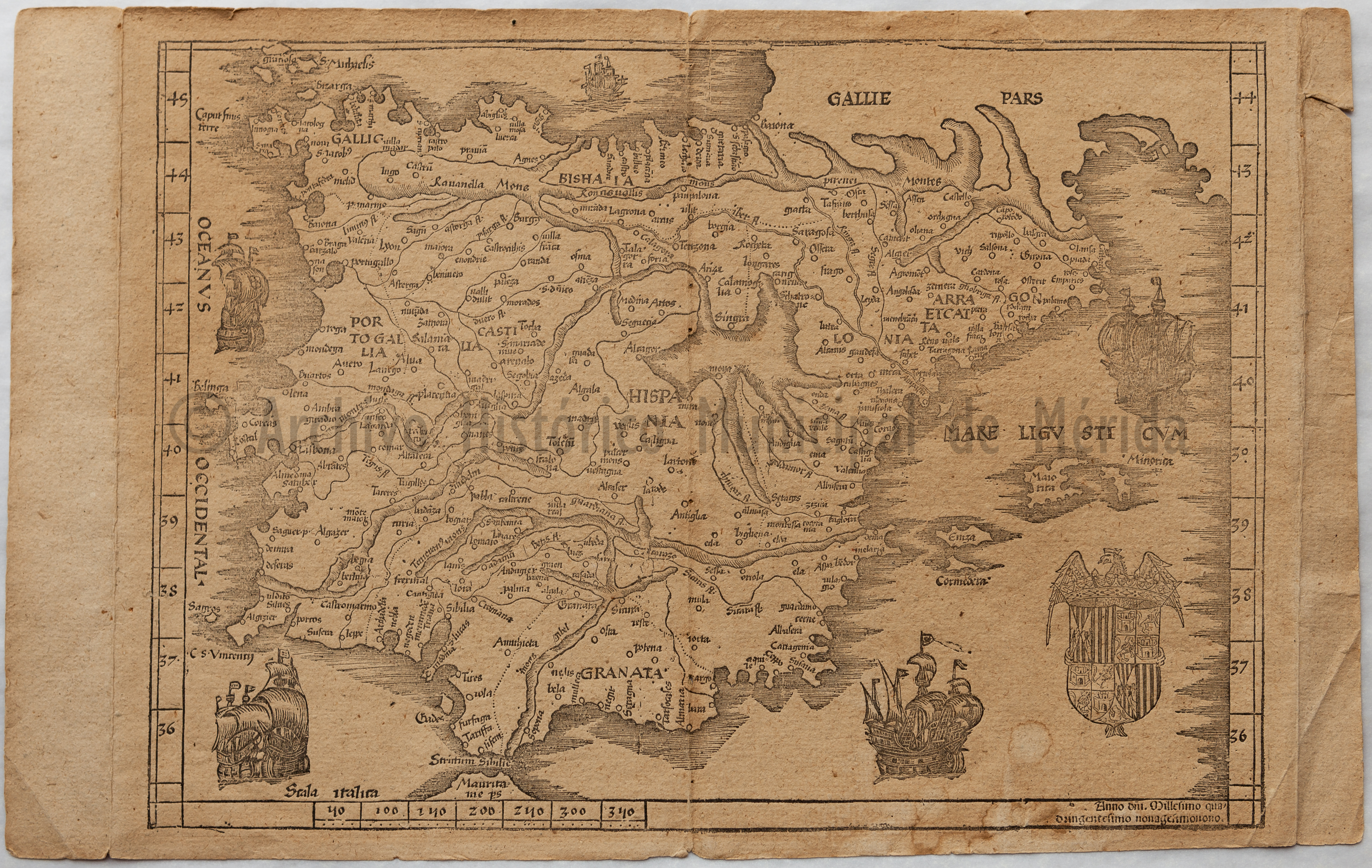 NOTAS Mapa falsificado a partir del ejemplar del Instituto Geográfico Nacional (Signatura 32-D-48). – Marco con rotulación de grados, solamente en los paralelos. – En el mar, cinco navíos con velas desplegadas y el escudo de España con la imagen invertida. – Rotulación: letra gótica. – Relieve por sombreado. – Márgenes graduados ; indica la latitud. – Hidrografía destacada. – En el ángulo inferior derecho, la fecha de 1499 en letra gótica poco legible y lengua latina. – Ciudades representadas según su importancia mediante círculos. – Costas sombreadas con un fino rayado. – Cobertura geográfica: Comprende la península Ibérica, las islas Baleares y la costa NO de África. – Toponimia escasa, en latín. – En: Manso Porto, Carmen. Revisión del mapa moderno de España en la geografía de Ptolomeo: a propósito de una falsificación. 'Revista de Estudios Colombinos', nº 13, junio 2017, pp. 51-60. |