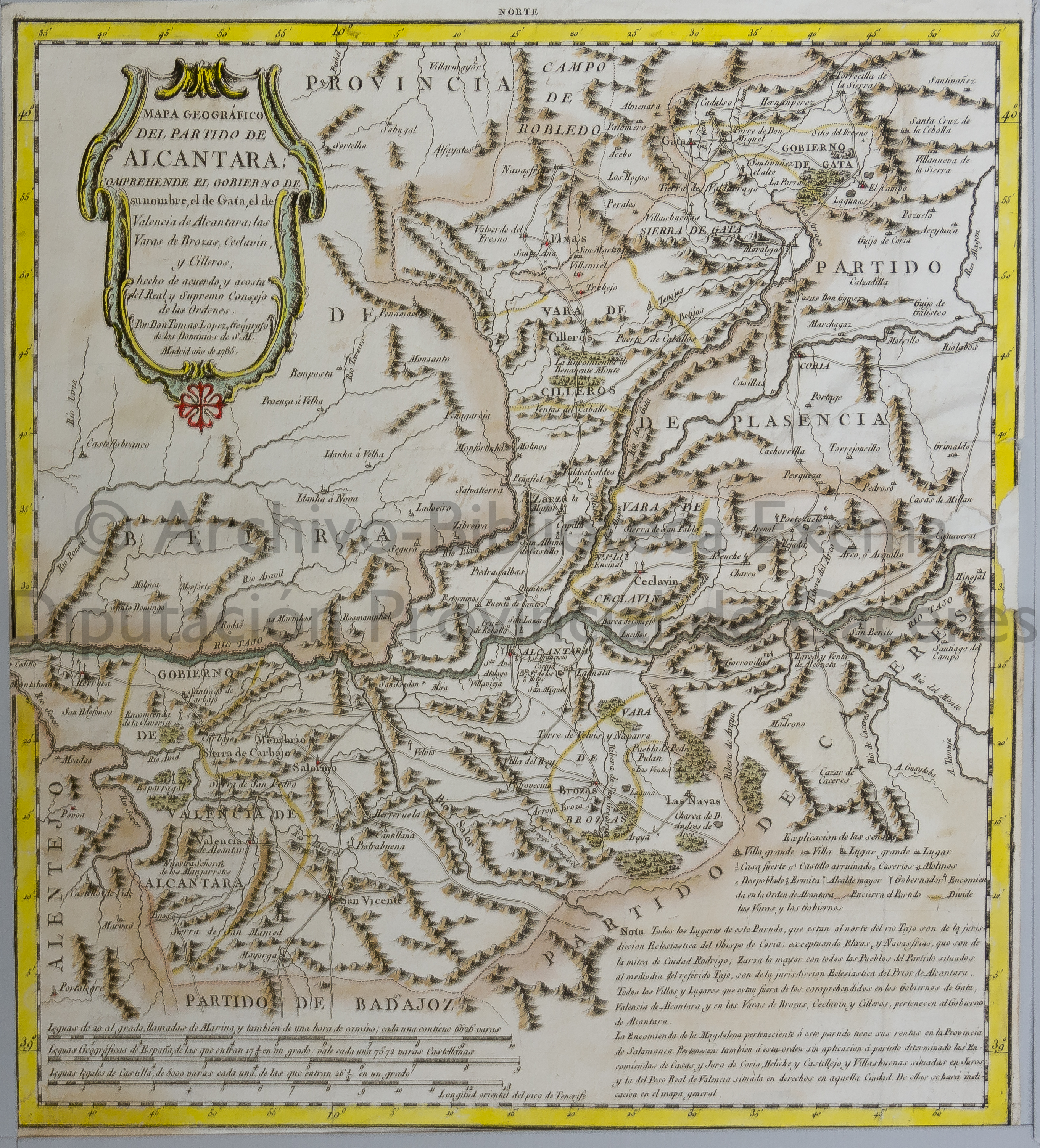 NOTAS Escala expresada en otras unidades. – Longitud oriental del pico de Tenerife. – Márgenes graduados. – Relieve por montes de perfil y sombreado. – En el ángulo superior izquierdo título dentro de una cartela en cornucopia con la cruz de la Orden de Alcántara |
