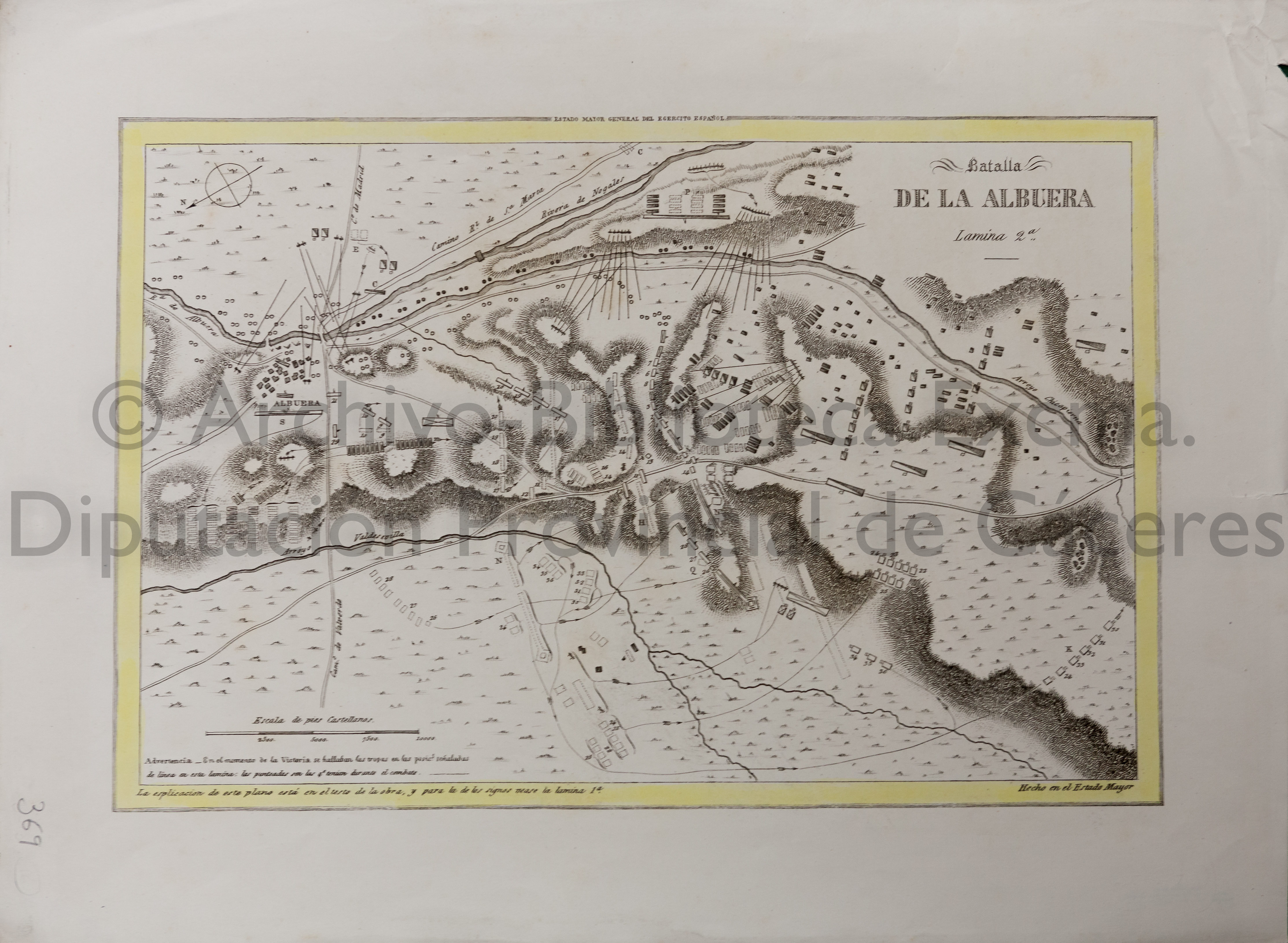 NOTAS Orientado con flecha en cuadrante. – Relieve representado por sombreado y por normales. – Tabla de signos convencionales para indicar las posiciones de ambos ejércitos. – Leyenda explicativa sobre el desarrollo de la batalla, indicándose en el mapa algunos movimientos mediante clave alfabética |
