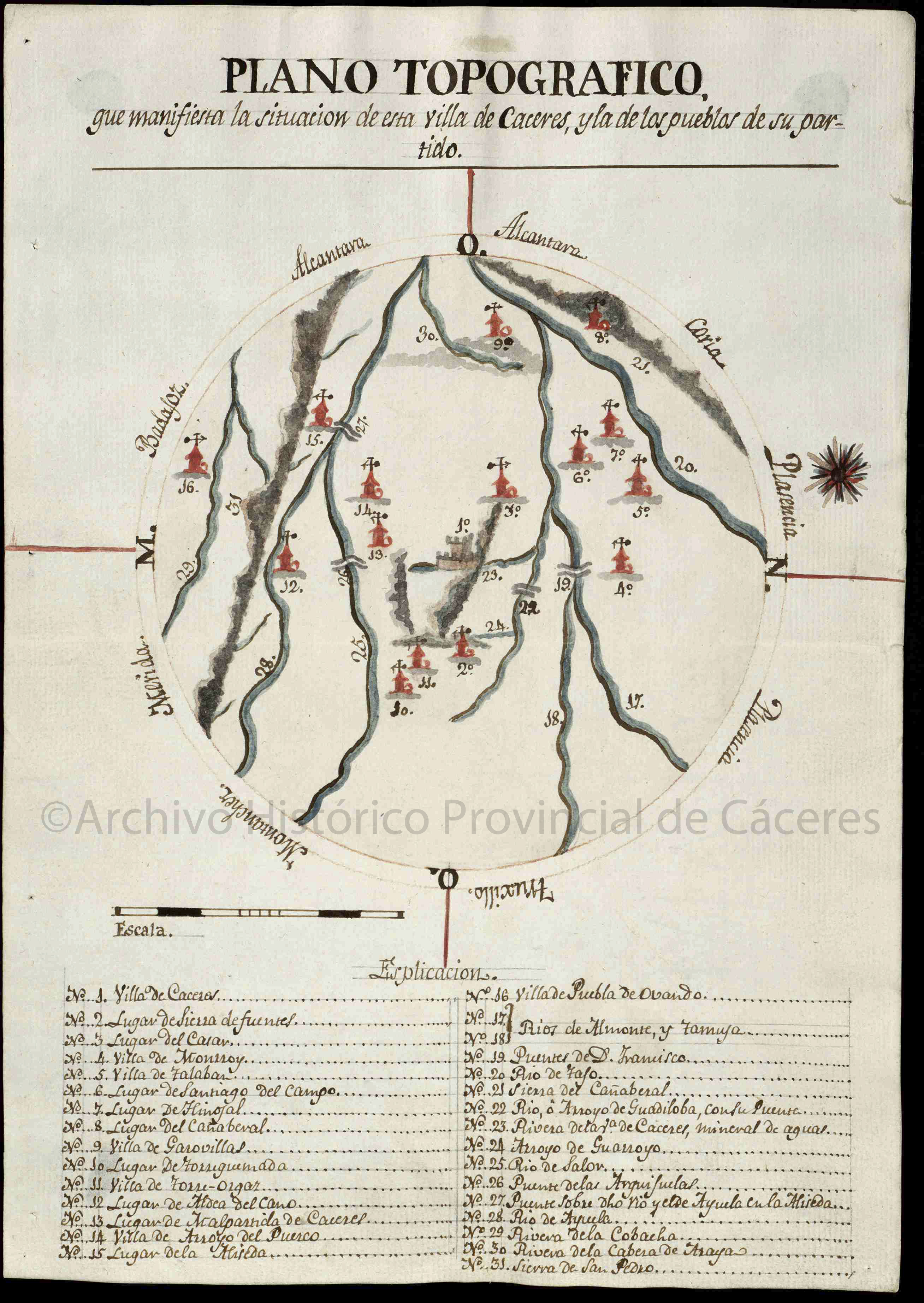 Plano topográfico que manifiesta la situación de esta villa de Cáceres y la de los pueblos...