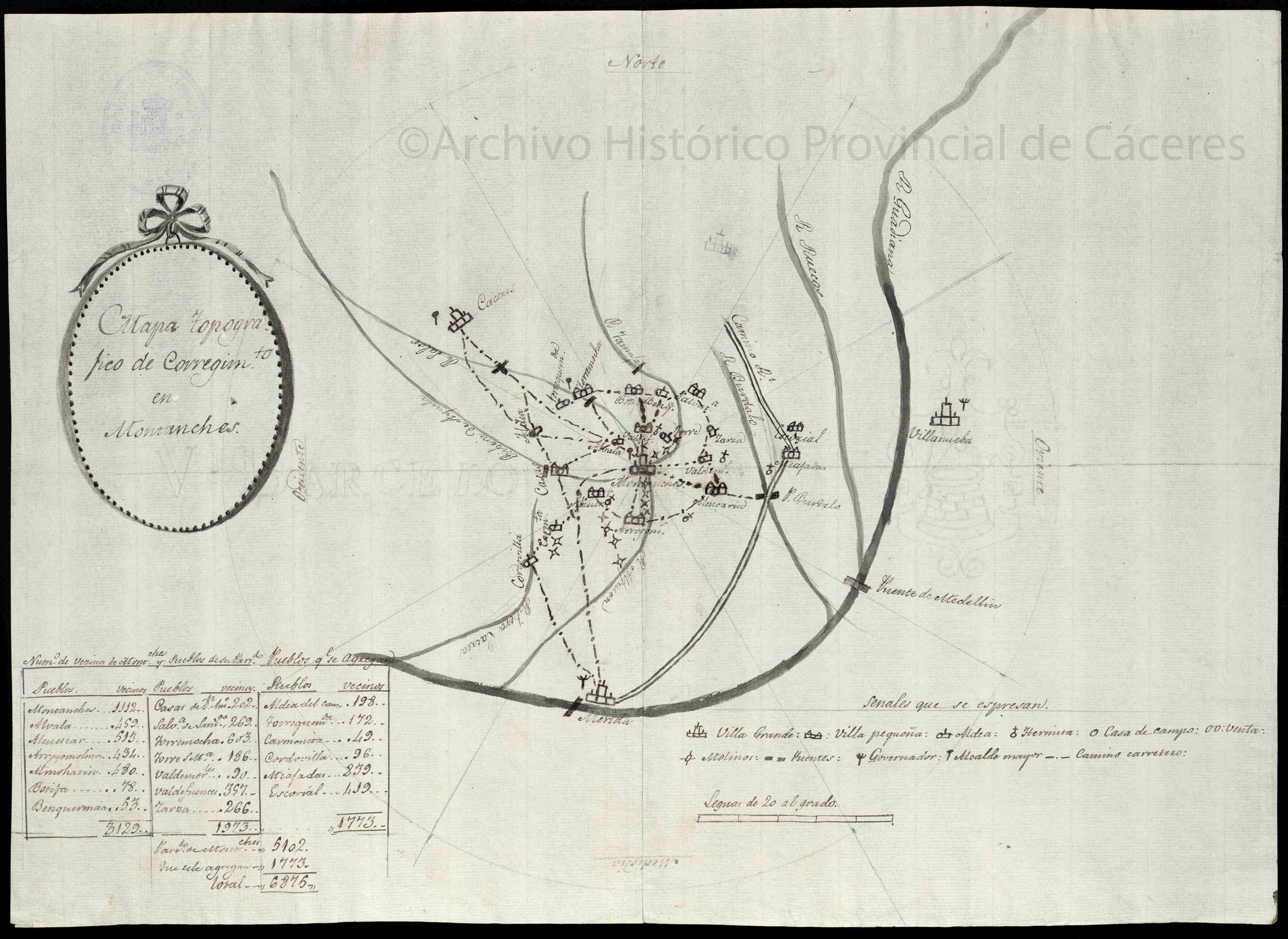 NOTAS Representa la zona de Montánchez y los pueblos de alrededor. – Red hidrográfica y pueblos representados por edificaciones. – Tintas en color. – Contiene nota explicativa sobre los pueblos y su número de vecinos. – Título en cartela decorado con lazo en la paarte superior |