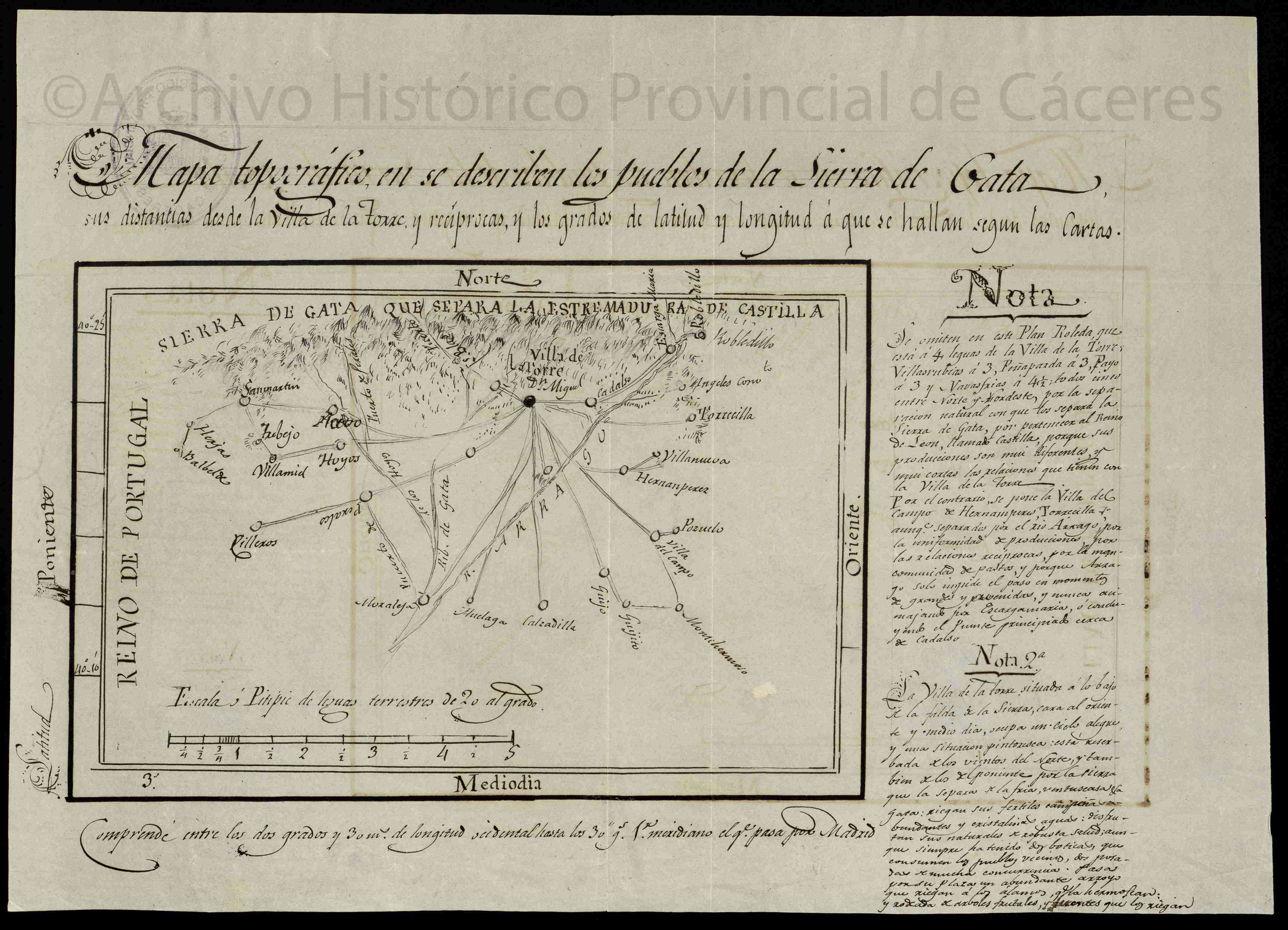 NOTAS Representación de núcleos urbanos mediante círculos según su importancia, caminos, hidrografía y orografía. – Indicación de las distancias entre poblaciones. – Márgenes graduados. – Relieve por sombreado. – Plumilla en tinta negra. – Contiene notas explicativas. – Distancias desde la villa de la Torre y reciprocas y los grados de latitud y longitud a que se hallan según las cartas. – Nota en margen inferior: 'Comprende entre los dos grados y 30' de longitud occidental hasta los 30' sg. del meridiano el que pasa por Madrid' |
