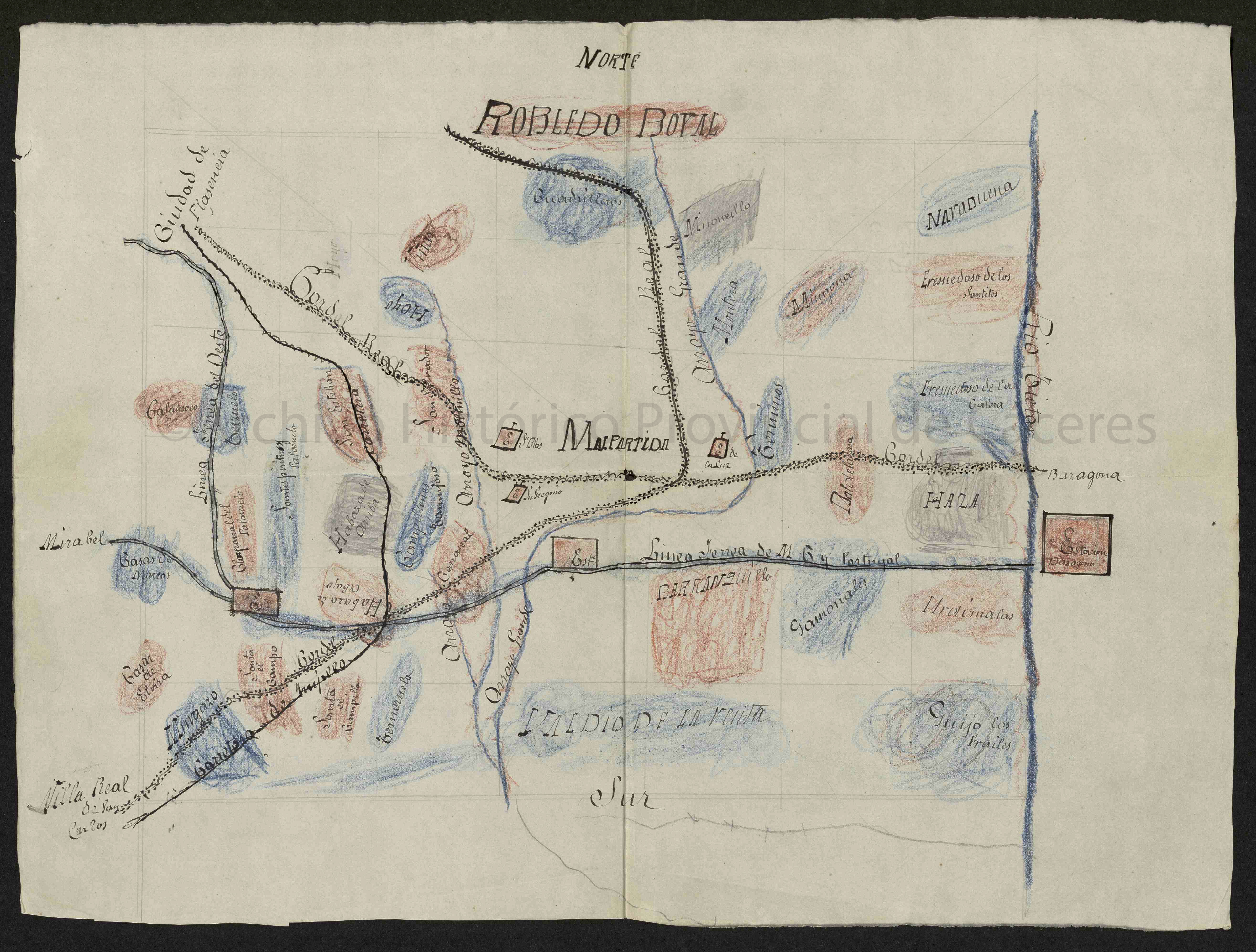 NOTAS Representación del término de Malpartida de Plasencia, caminos vecinales, vías férreas, hidrografía, construcciones y límites de la demarcación. – Tintas y colores |
