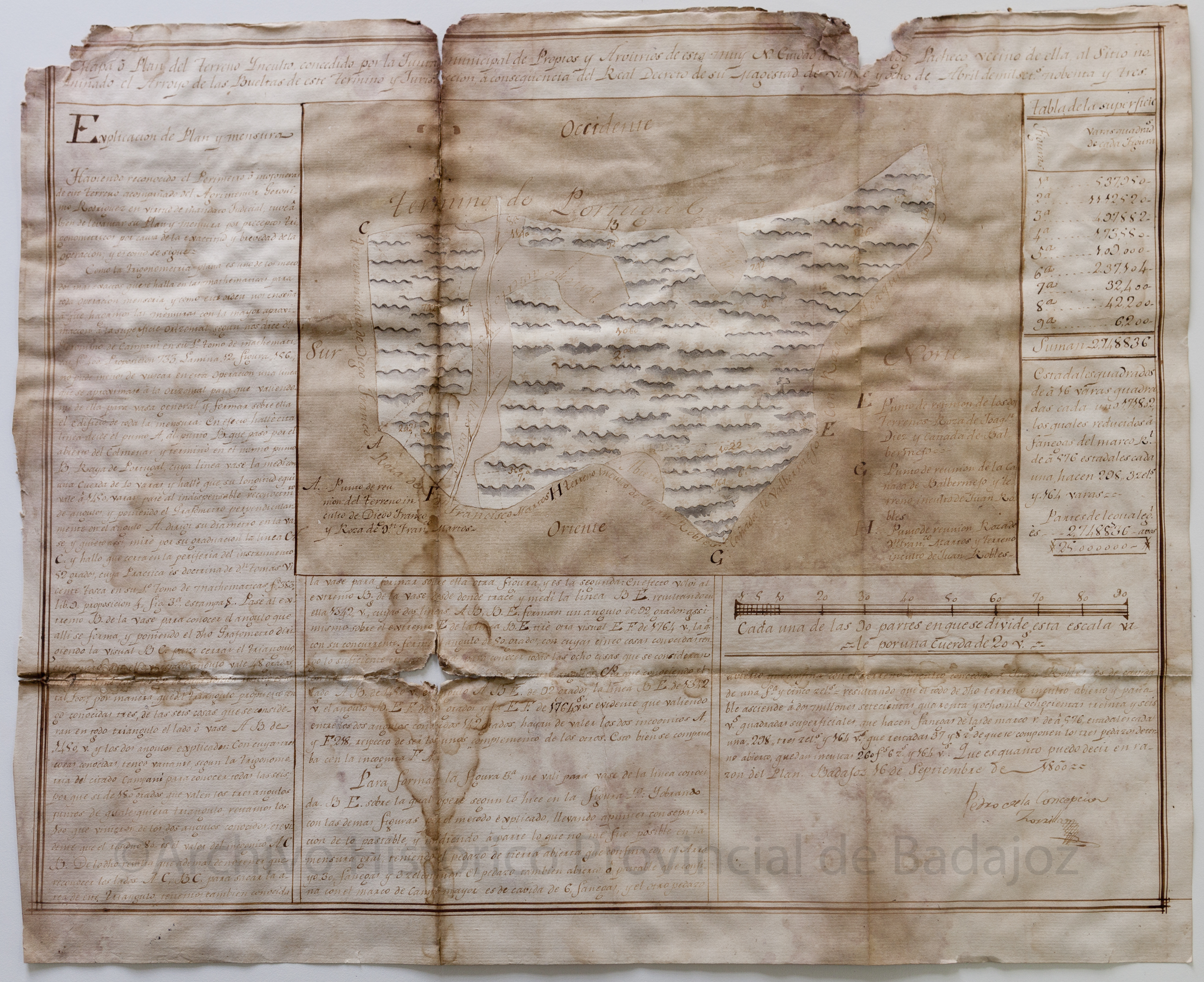 NOTAS Representación de la zona del Arroyo de las Vueltas y del curso del mismo. – Indicados los puntos cardinales. – Incluye leyenda numérica con la tabla de superficies de los terrenos y explicación sobre los terrenos medidos. – Fecha exacta del documento: 16 de septiembre de 1800 |