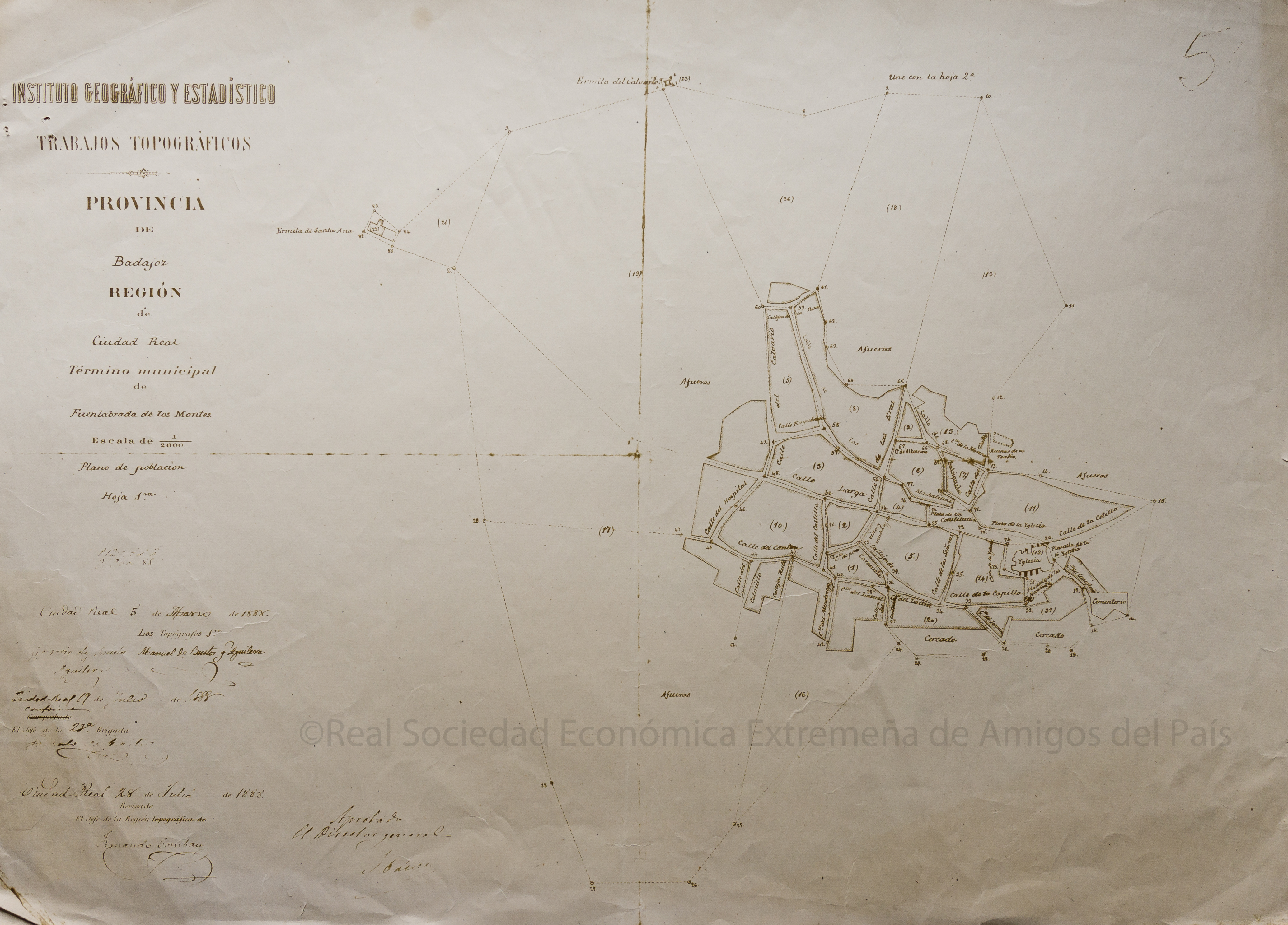 NOTAS Representación del núcleo de Fuenlabrada, límites y parcelas o solares. – Toponimia. – Plumilla en tinta marrón.– Fecha exacta del documento: 5 de marzo de 1888. — Fotocopia del original. — Cortado el pie donde aparecen los autores. — Incluye: Hoja 1ª: Plano de población. Escala 1:2.000. Revisado 28 del julio de 1888. Hoja 2ª: Plano de población. Escala 1:200. – El documento original se encuentra en los Fondos Cartográficos © Instituto Geográfico Nacional www.ign.es |