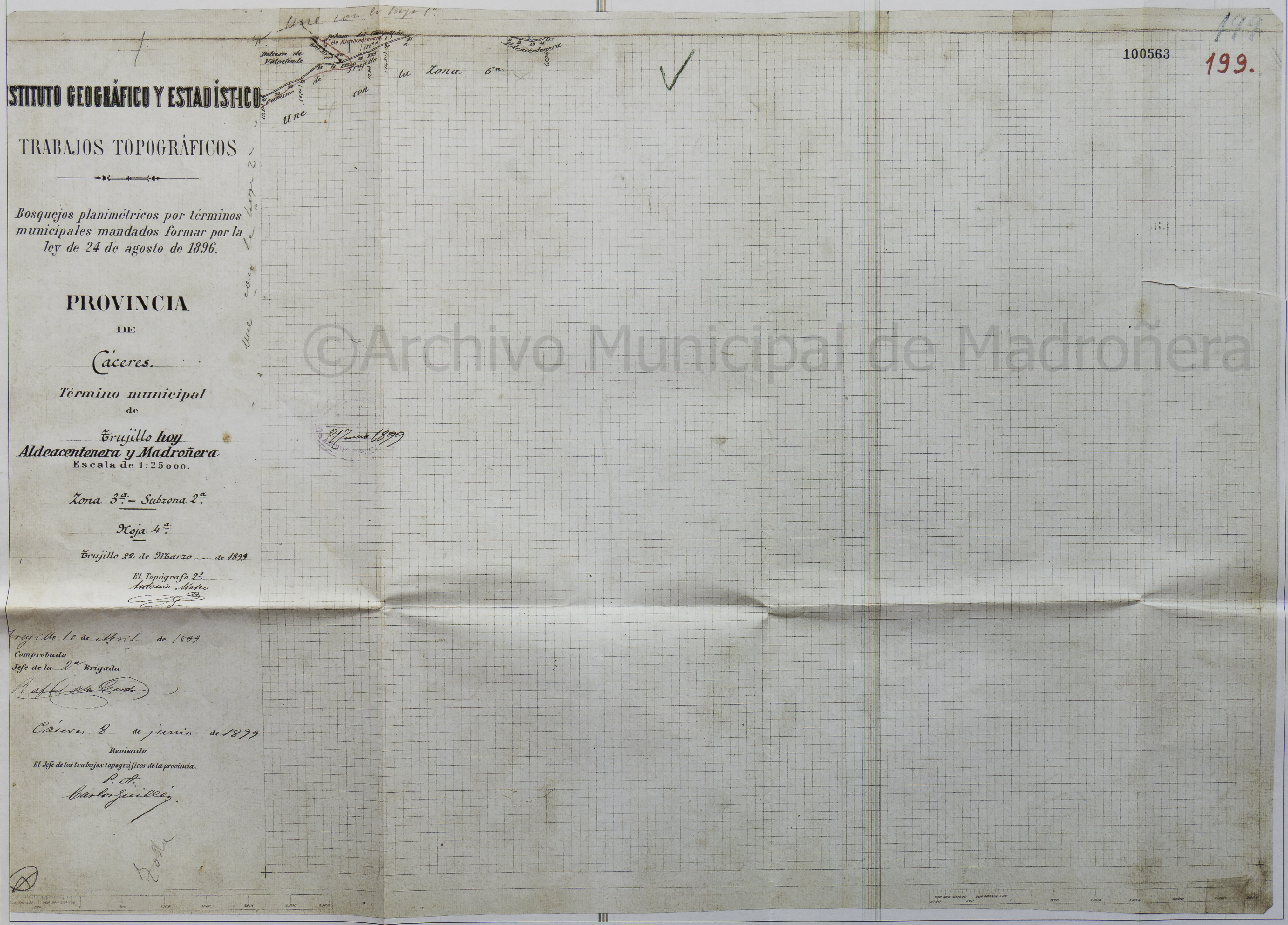 NOTAS Representación de los términos municipales de Trujillo, Madroñera y Aldeacentenera, red de caminos, hidrografía, límites administrativos y puntos kilométricos y distancias. – Abundante toponimia. – Bosquejos planimétricos por términos municipales mandados formar por la Ley de 24 de agosto de 1896. – Fotocopia del original. – El documento original se encuentra en los Fondos Cartográficos © Instituto Geográfico Nacional www.ign.es. – Fecha exacta del documento: 22 de marzo de 1899; fecha de comprobación: 10 de abril de 1899; fecha de revisión: 8 de junio de 1899. – Incluye notas explicativas |