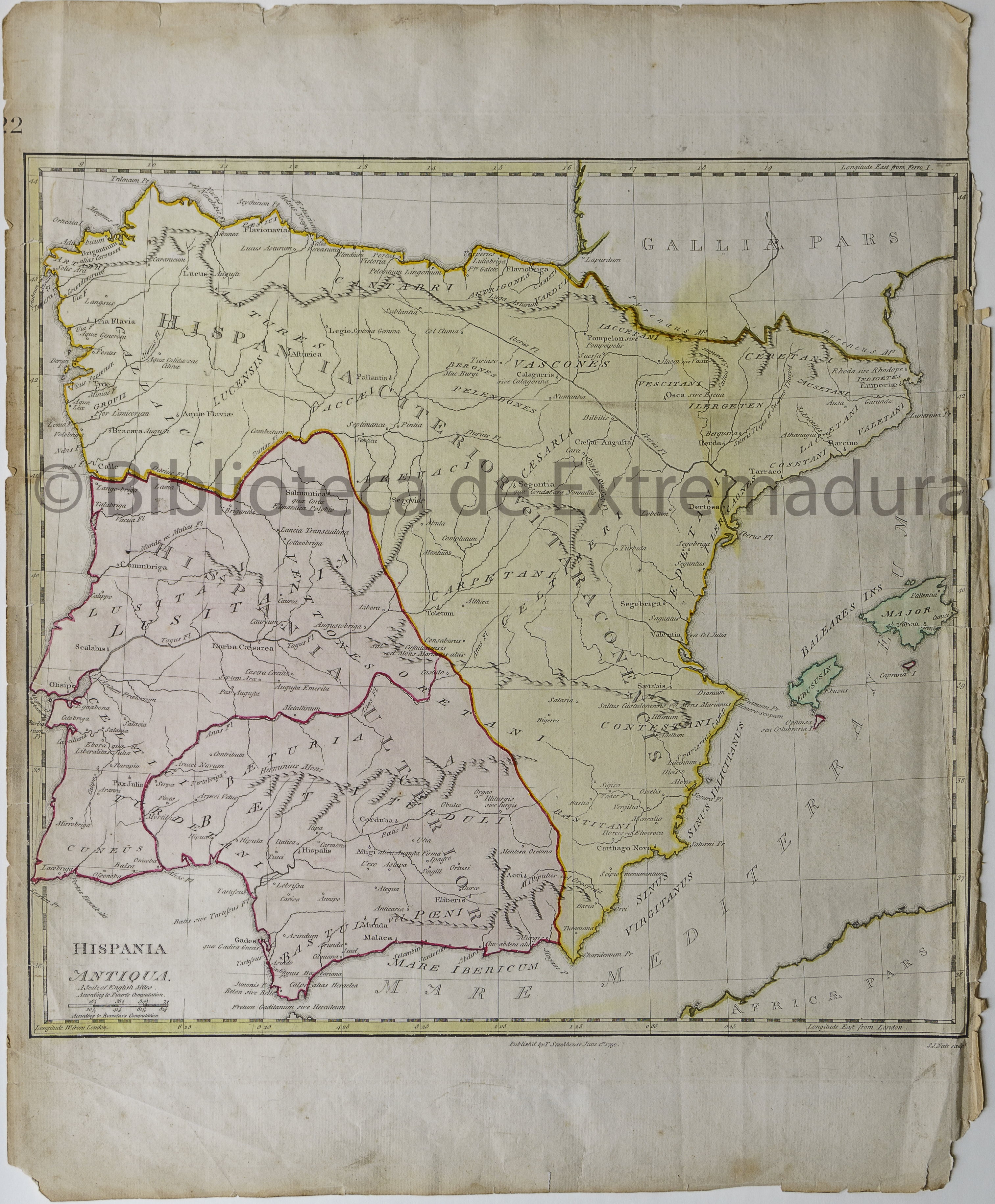 NOTAS En el ángulo superior izquierdo: 22. – Relieve por montes de perfil y sombreado. – Márgenes graduados. – Dibujados meridianos y paralelos formando cuadrícula. – En el margen superior se dan las longitudes referidas al meridiano de: Ferro y en inferior las referidas al meridiano de: London. – Costas sombreadas. – Lugares representados por círculos. – Toponimia en latín. – Divisiones administrativas diferenciadas por color |