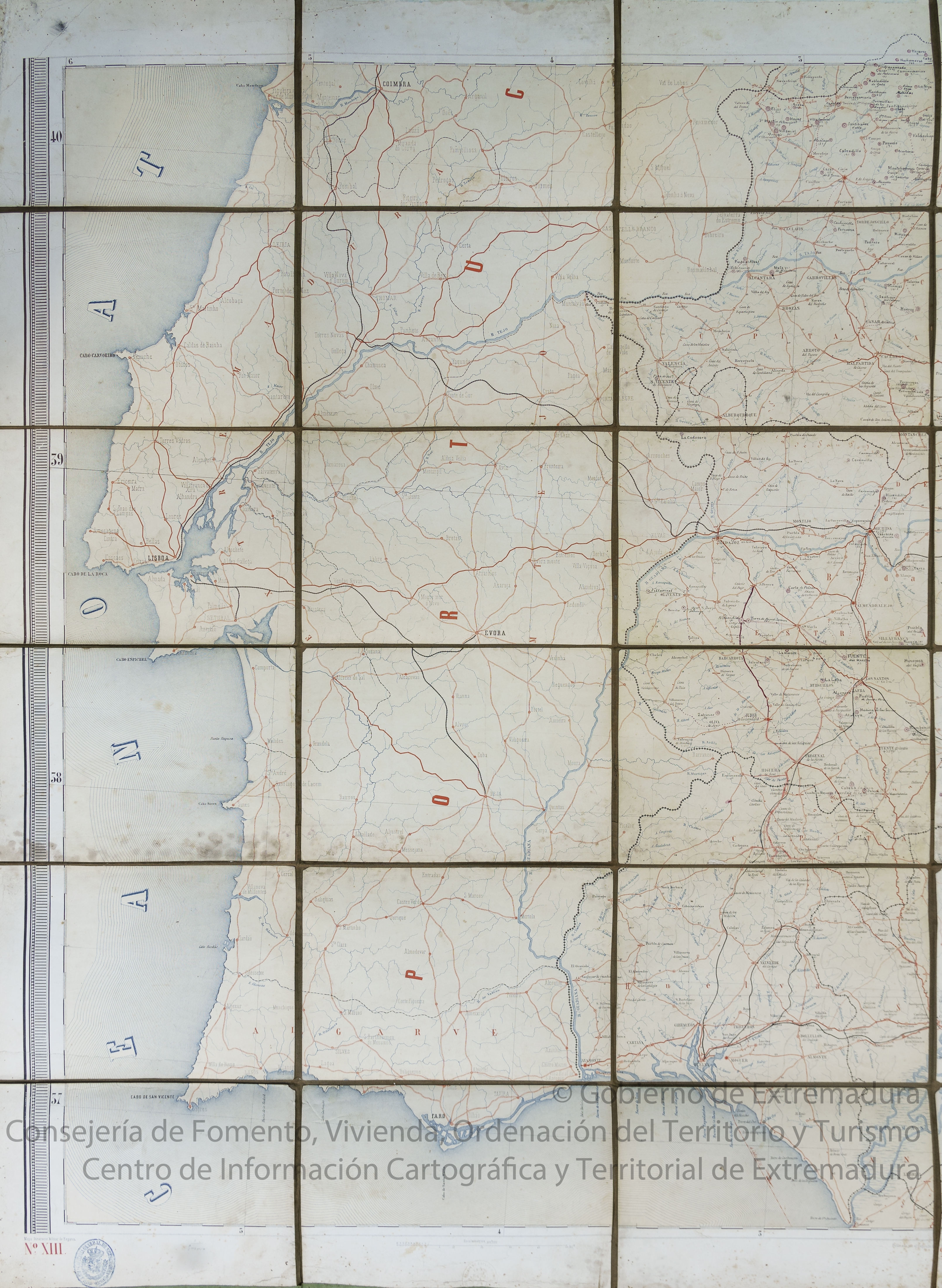NOTAS Márgenes graduados. – Hidrografía. – Distancias indicadas en Km. – La hoja XVI es el cuadro de reunión. – La medida del mapa montado mide, según la Biblioteca Nacional, 216 x 250 cm. – El mapa que se muestra es una compilación de varias hojas para abarcar la región de Extremadura, concretamente las hojas V, VI, IX, X, XIII y XIV. – Incluye notas manuscritas. – Abarca también Portugal. – Los ejemplares conservados en el Instituto Geológico y Minero son las hojas individuales números IX, X, XIII y XIV |