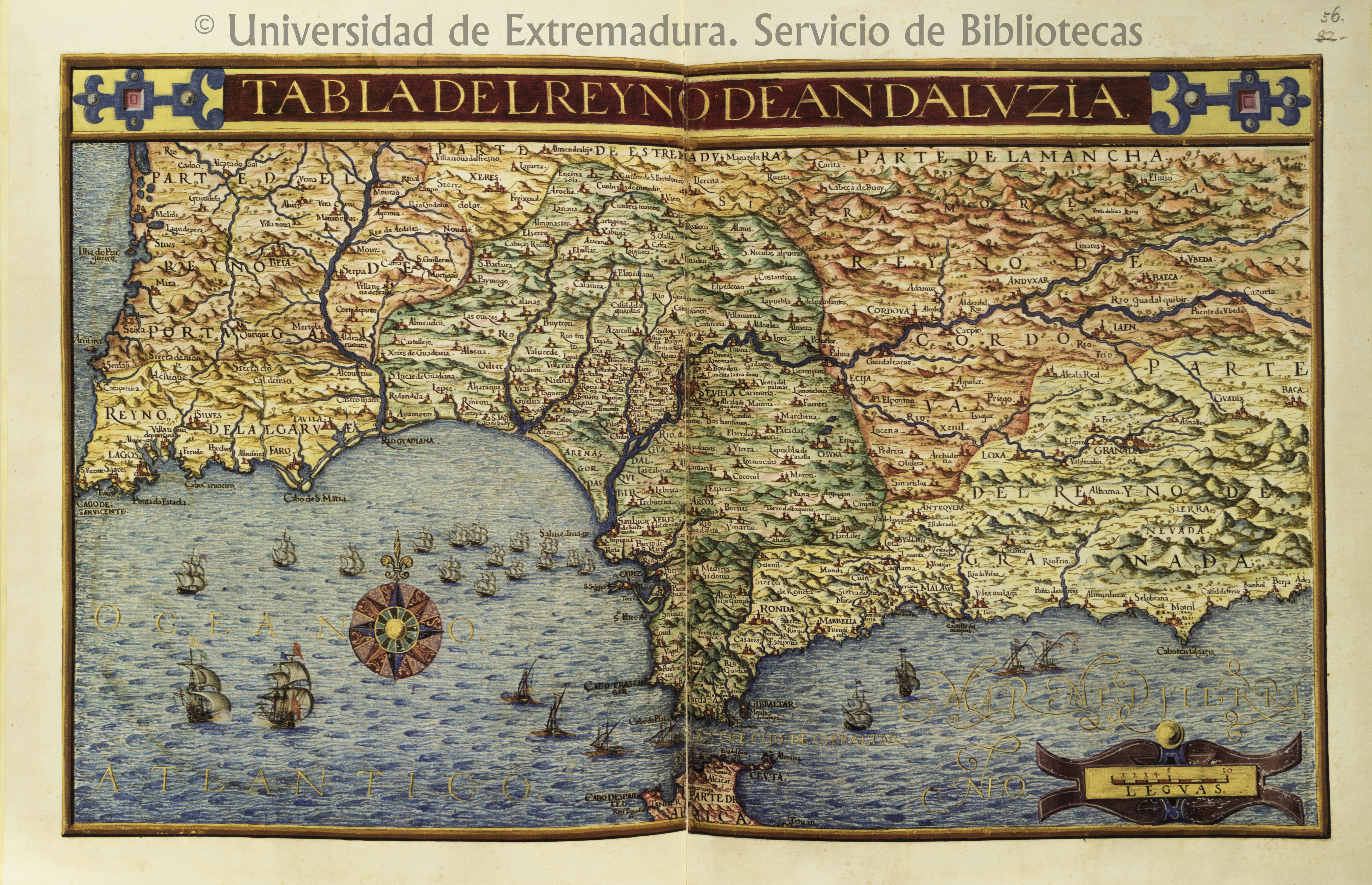 NOTAS Comprende Andalucía, parte de Extremadura y Portugal. – Ciudades representadas según su importancia mediante círculos y edificaciones. – Escala de 10 leguas. – Abundante toponimia. – En: Pereda, Felipe; Marías, Fernando. El Atlas del Rey Planeta: La «Descripción de España y de las costas y puertos de sus reinos» de Pedro Texeira (1634), 2002. – Orientado con rosa con lis. – Relieve por montes de perfil y sombreado. – Red hidrográfica. – Costas sombreadas. – Divisiones administrativas diferenciadas por líneas de color. – Incluye navíos en el mar. – Reproducción del atlas conservado en la Biblioteca Nacional de Viena con la signatura Codex Miniatus 46 |