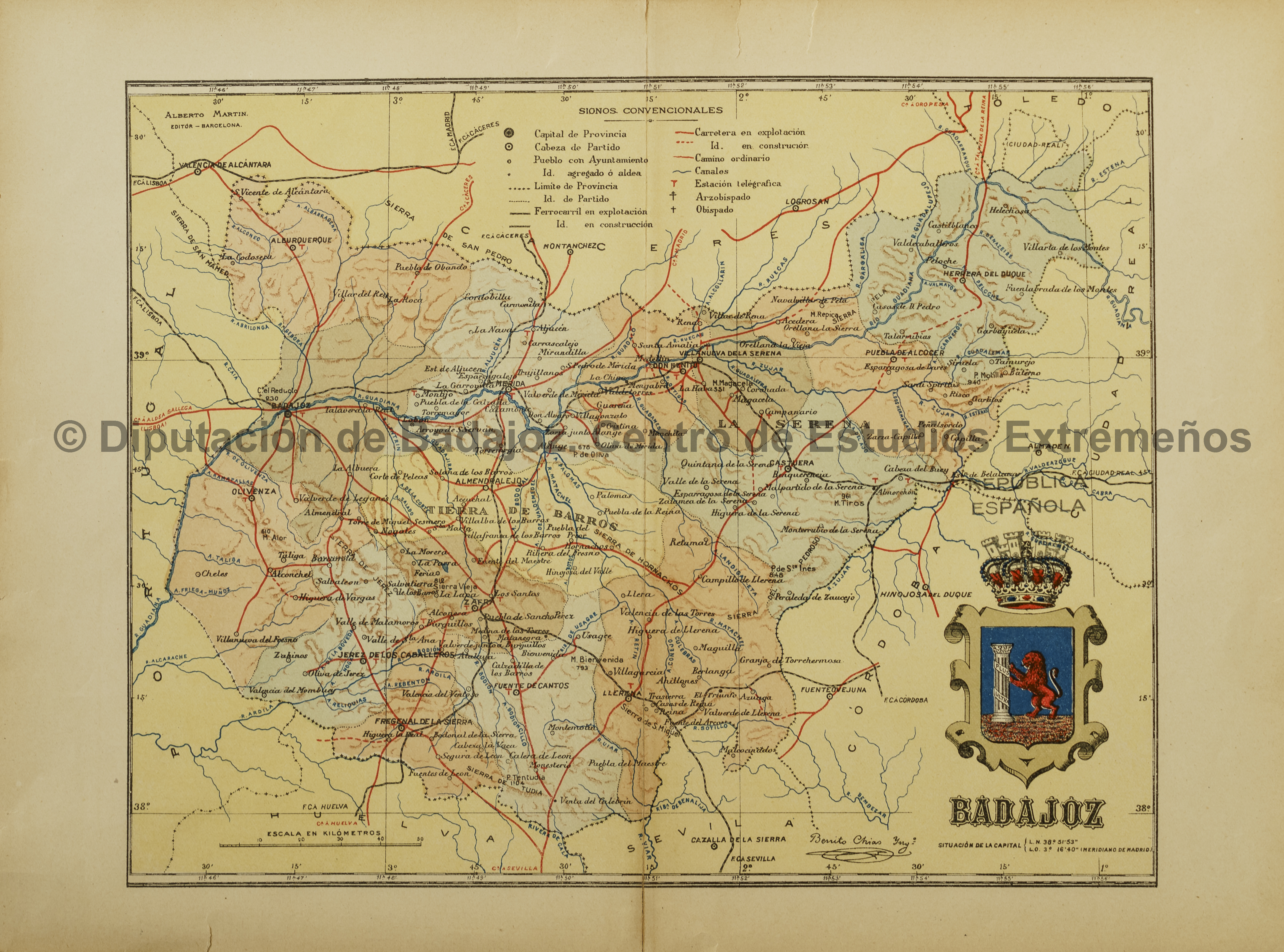 NOTAS En la esquina superior izquierda, escudo de Badajoz. – Sello en tinta en la parte superior izquierda: 'República española'. – Márgenes graduados. – Meridiano de origen: Madrid. – Relieve por sombreado. – Red hidrográfica. – Clave de signos convencionales indicando: divisiones administrativas y eclesiásticas, ciudades según su importancia, red de carreteras y ferrocarriles, etc. – Forma parte de la Colección de Cartas Corográficas de las provincias españolas. – Firma y rúbrica del autor. – En: 'Escudé Bartoli, Manuel. Atlas Geográfico Ibero-Americano España: cartas corográficas' |
