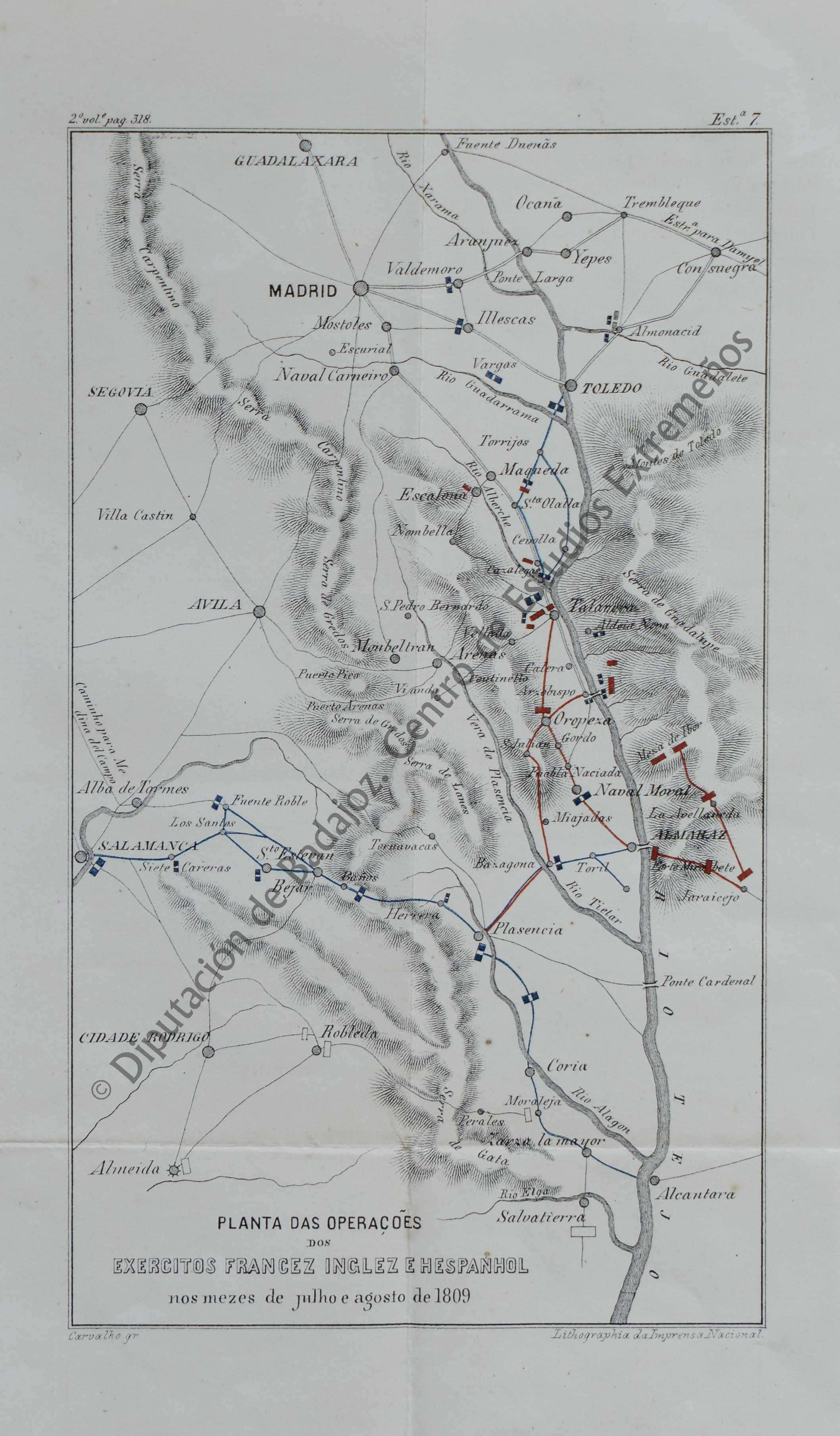 NOTAS Mapa que representa el combate entre Talavera y Puerto de Miravete, donde aparecen las provincias de Madrid, Guadalajara, Toledo, Ávila, Salamanca y municipios de la provincia de Cáceres. – Relieve por normales y montes de perfil. – Red hidrográfica y de comunicaciones. – Representa las ciudades por círculos según su importancia. – Toponimia en español y portugués. – En el margen superior derecho : “Est.ª 7”. – En el margen inferior izquierdo : “ Carvalho gr.”. – En el margen inferior derecho : “Lithographia da Imprensa Nacional”. – Representa la colocación de los batallones ingleses, franceses y españoles en los meses de julio y agosto de 1809. – En: Taveria, Alfredo Pereira. 'Estudo historico sobre a Campanha do Marechal Soult em Portugal considerada nas suas relações com a defeza do Porto'. – Lisboa : Typ. Cooperativa Militar, 1898 |