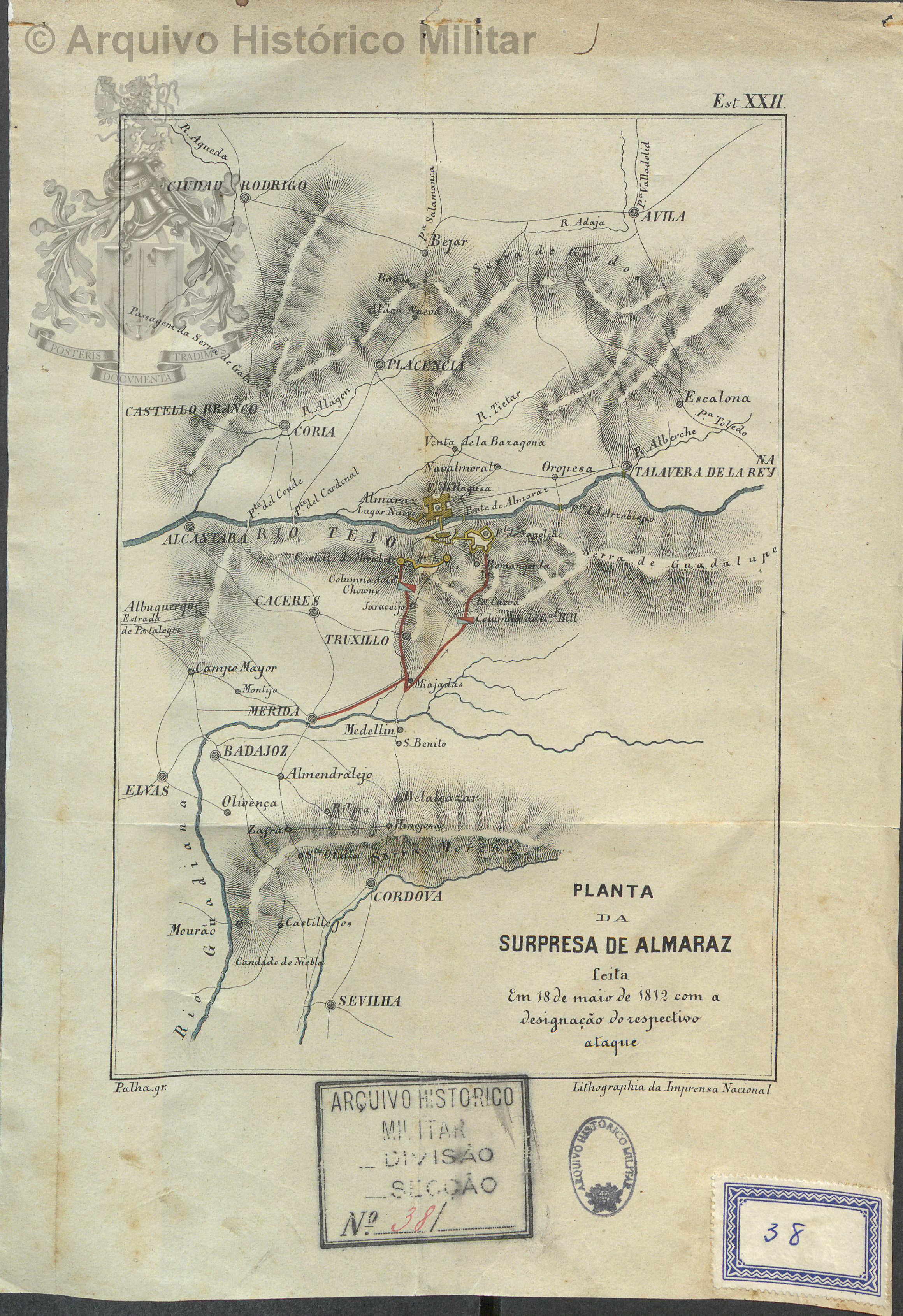 NOTAS Representación de las zonas comprendida entre Ávila, Ciudad Rodrigo, Castelo Branco, Elvas, Sevilla y Talavera de la Reina, además de los movimientos de los ejércitos y ataque al sitio de Almaraz en la noche del 18 de mayo de 1812. – Relieve por normales. – Red hidrográfica y de comunicaciones. – Representa las ciudades por círculo según su importancia. – En el margen superior derecho: “Est.ª XII”. – En el margen inferior izquierdo: “Palha gr.”. – En el margen inferior derecho: “Lithographia da Imprensa Nacional”. – En: Luz Soriano, Simão José da. “História da Guerra Civil e do estabelecimento do governo parlamentar em Portugal comprehendendo a história diplomática militar e política d´este reino desde 1777 até 1834”, 1866-1890, tomo VI. – Vegetación. |