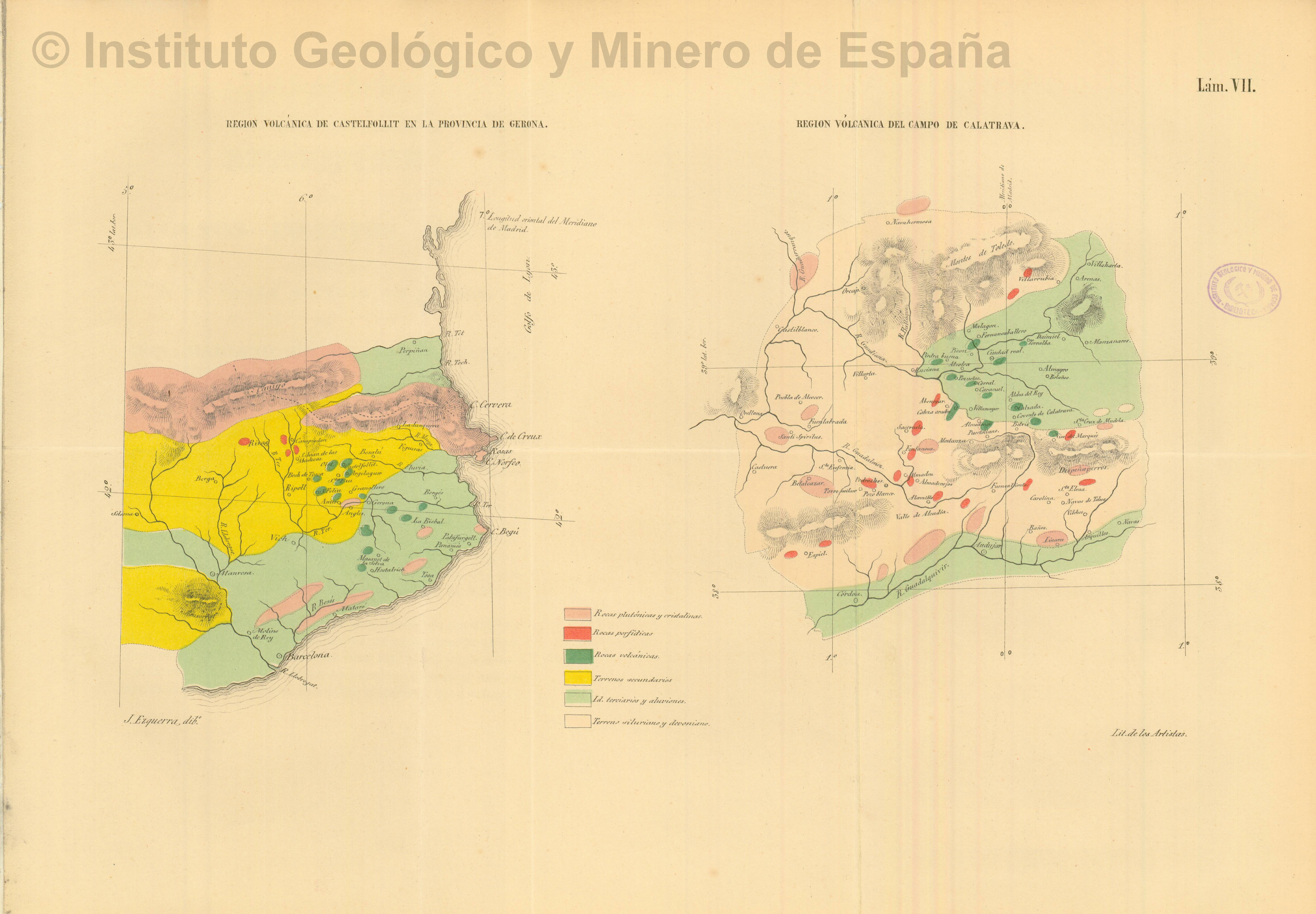 NOTAS Representación de los cortes geológicos en la zona de Campo de Calatrava y Gerona, incluyendo la red de caminos e hidrografía. – Relieve por normales y curvas de nivel. – Contiene leyenda geológica. – Red de meridianos y paralelos formando cuadrícula. Longitud oriental del meridiano: Madrid. – En: Memorias de la Real Academia de Ciencias Exactas, Físicas y Naturales de Madrid: Serie Unida ; Tomo I, lámina VII |