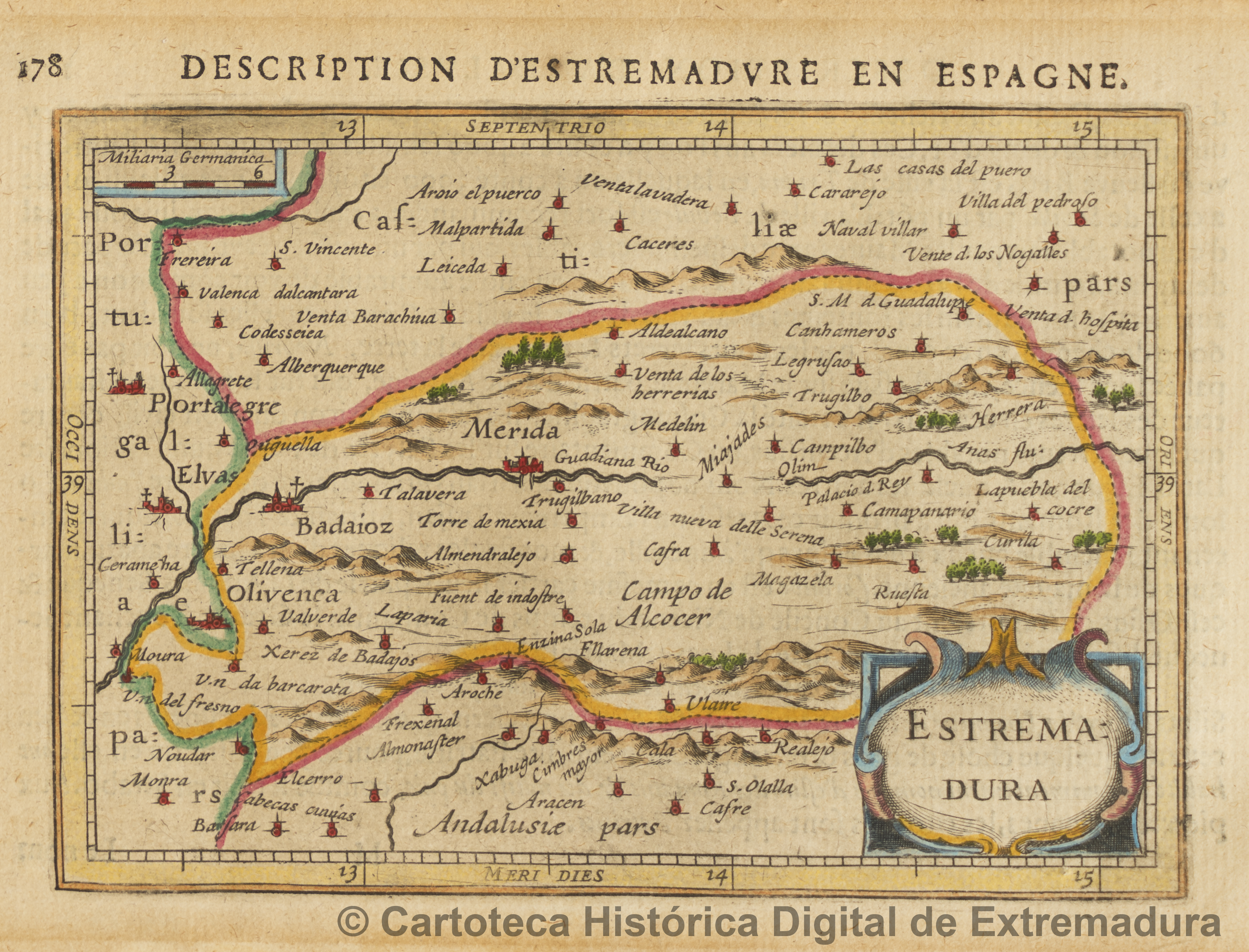 NOTAS En el margen superior: “178 Description D´Estremadure en Espagne”. – Toponimia en español y francés. – Procede de la edición francesa de 1618 de la obra de Petrus Bertius “Tabularum Geographicarum Contractarum”. – Orientado. – Relieve por montes de perfil y sombreado. – Márgenes graduados. – Red hidrográfica y de caminos. –Arbolado. – Ciudades representadas por conjuntos de edificaciones según su importancia. – Coloreadas a mano la cartela, márgenes, escala, divisiones administrativas, cadenas montañosas, arbolado y construcciones. |