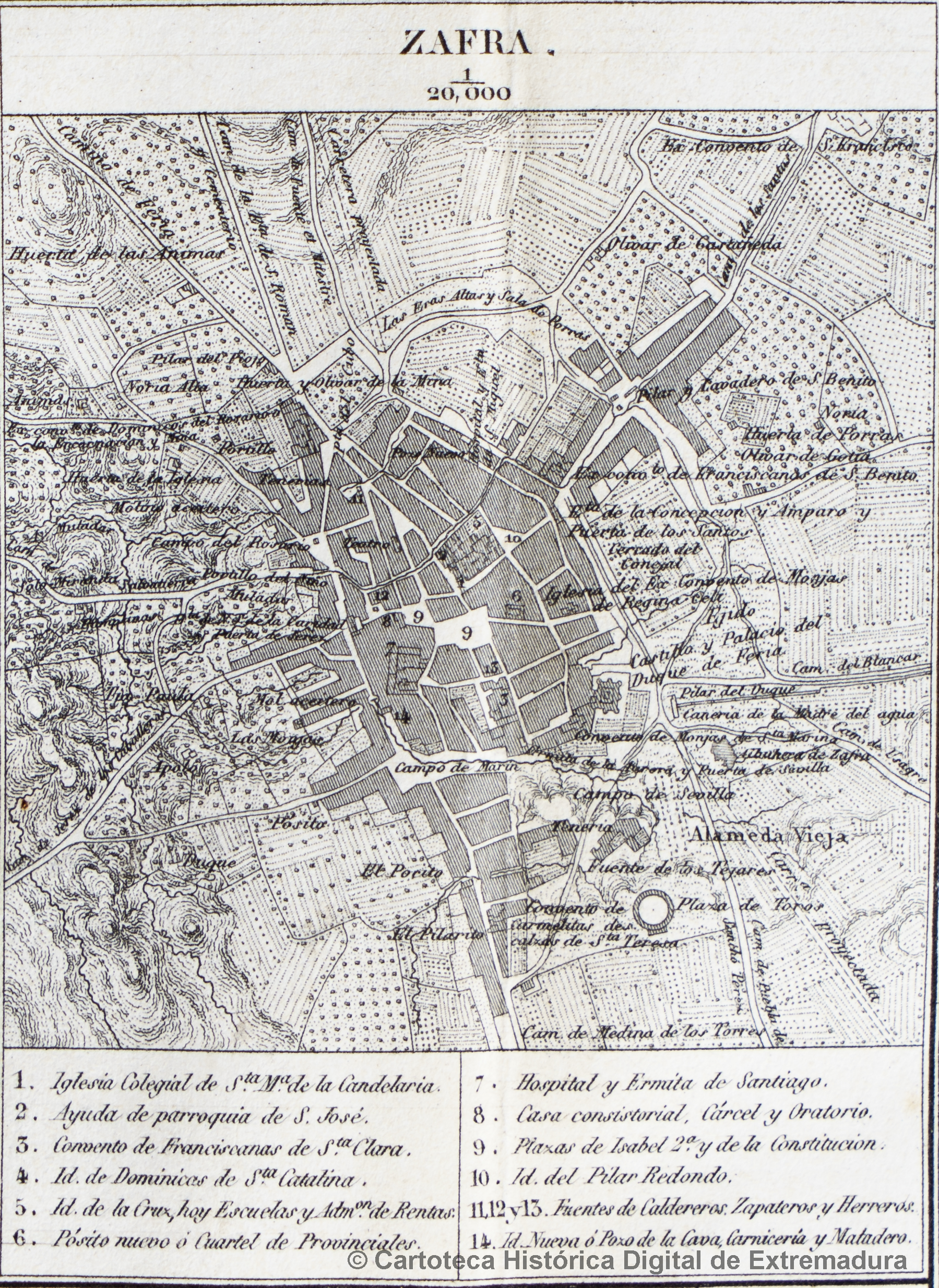 NOTAS Clave alfanumérica con los edificios eclesiásticos y civiles más importantes como iglesias, conventos, el Pósito, la cárcel, el hospital, las Plazas, el matadero, etc. - Abarca la ciudad de Zafra y alrededores. - En: Coello y Quesada, Francisco. “Atlas de España y sus posesiones de Ultramar. Cuarta hoja de suplemento: León y Extremadura”, 1840-1870. - Relieve por normales y sombreado. – Red hidrográfica y de caminos. - Arbolado y cultivos representados. – Datos de la publicación sacados de la obra en la que se incluye |