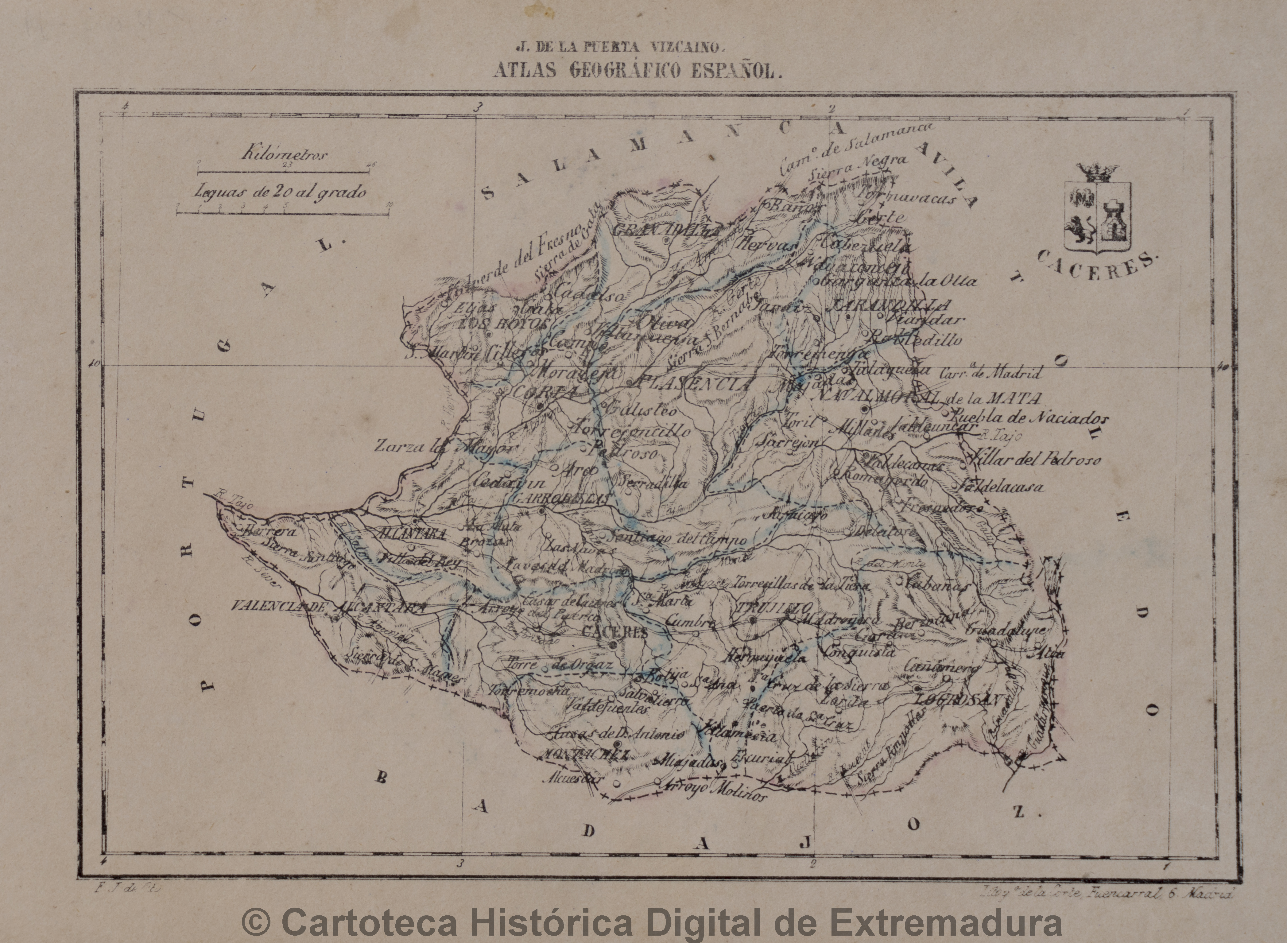NOTAS En el margen superior derecho escudo de Cáceres. – En el margen inferior izquierdo: “F.J“. – En margen superior: 'Atlas Geográfico Español'. – Abarca la provincia de Cáceres. – Abundante toponimia. – En: Puerta Vizcaíno, Juan de la. “Atlas Geográfico Español”, 1860. – Relieve por normales. – Márgenes graduados. – Red hidrográfica. – Divisiones administrativas provinciales por líneas de color azul y las fronteras de color rojo. – Representa mediante circulo las ciudades según su importancia |