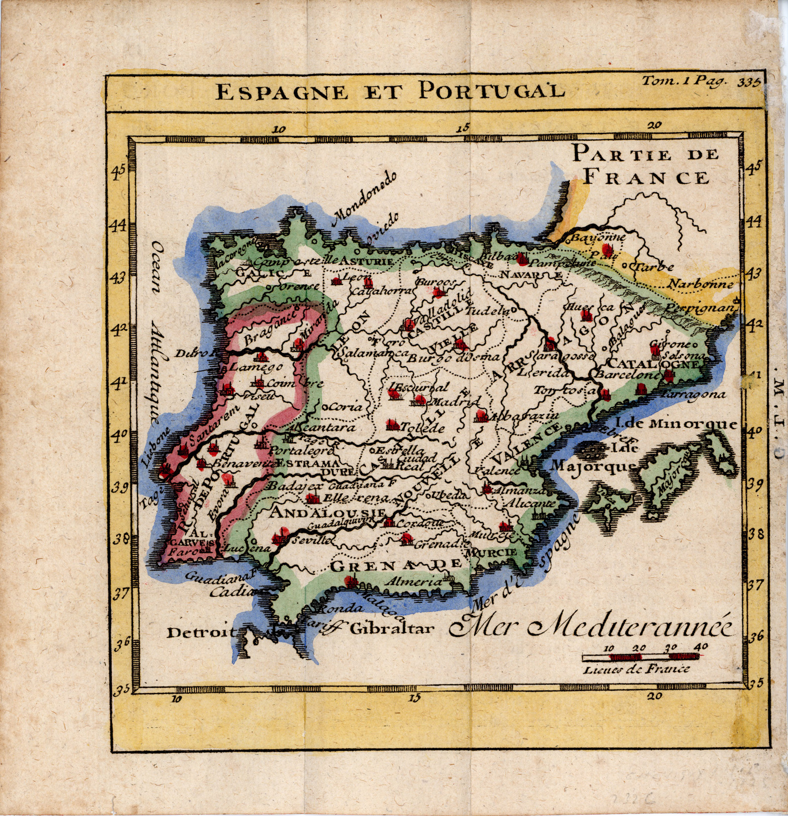 NOTAS Mapa grabado en placa de cobre que comprende la península Ibérica y las islas Baleares. – Extraído de una edición de la obra `La Science des personnes de cour...`, publicada por Chevigny en 1725, cuyo autor fue el geógrafo francés Guillaume de L`Isle. – Marco doble con rotulación de grados. En la parte superior, centrado, figura el título en francés y, a la derecha, tom.1, pag.335; en el ángulo inferior derecho la escala gráfica en leguas francesas. – Planimetría con las ciudades más importantes representadas por agrupación de edificios y división administrativa en color. Hidrografía con la red principal, con denominación de los ríos más importantes. – La costa aparece realzada con rayado horizontal. Abundante toponimia en francés y castellano. Rotulación en letra romanilla e itálica. – Datado durante el reinado de Felipe V (1700-1746) |