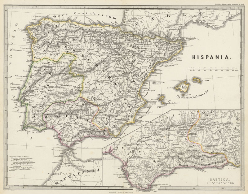NOTAS Marco graduado en todos los mapas, meridianos y paralelos formando cuadrícula, en la esquina superior derecha de cada uno de los mapas 'Spruner - Menke: Atlas Antiquus' seguido del número de mapa correspondiente en números romanos; Tertio editit, Theodorus Menke. – División administrativa en color. – Escalas gráficas. – Red de caminos, hidrografía con la red principal y vías de comunicación. – Relieve por sombreado. – Costa realzada con rayado horizontal. – Bastante toponimia en latín. Rotulación en letra romanilla e itálica. – En: Atlas Antiquus / Karoli Spruneri opus. |