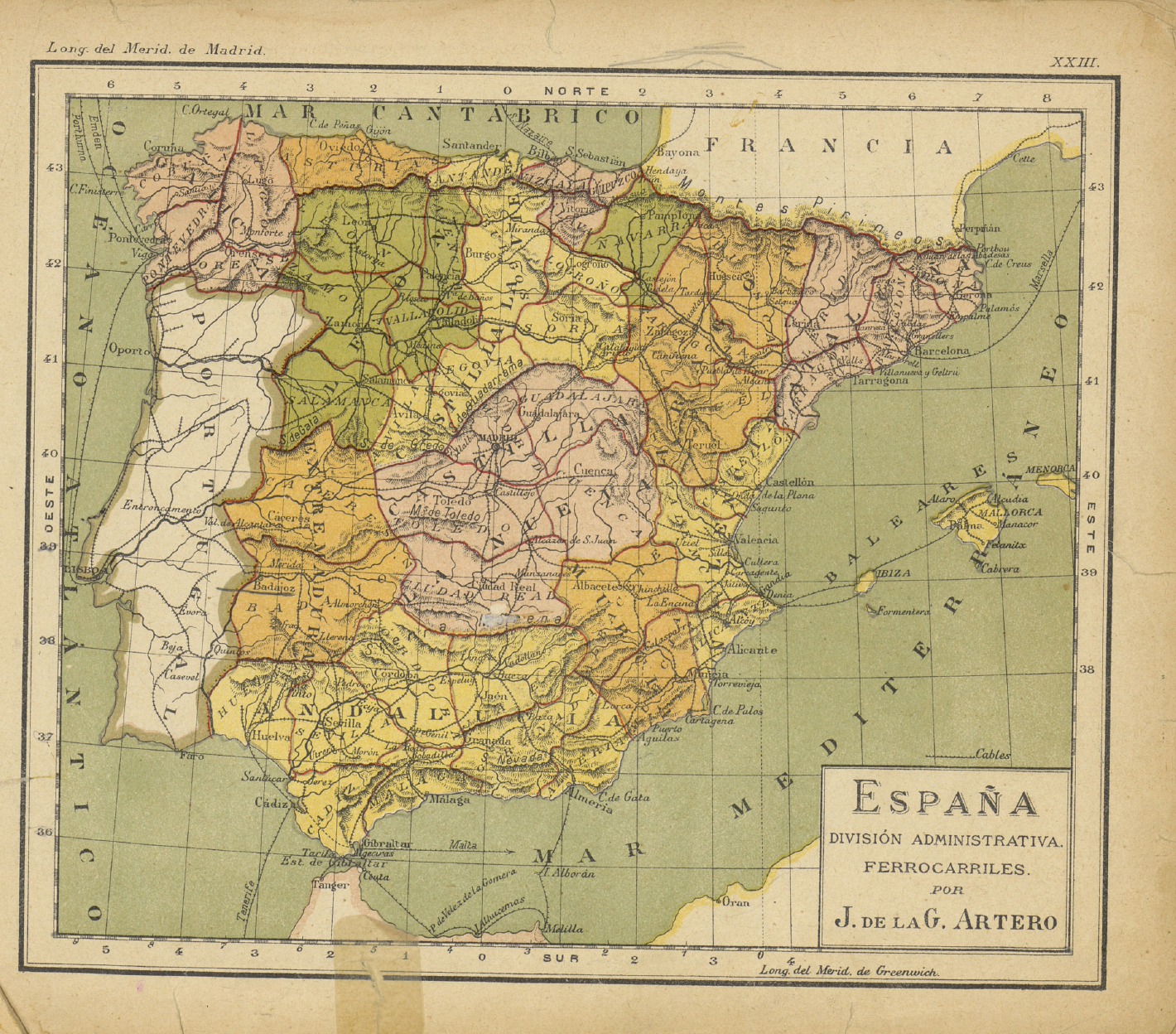 NOTAS Marco graduado, meridianos y paralelos formando cuadrícula. – Toponimia en español. – División administrativa en color. – Longitud del Merid. de Madrid; Longitud del Merid. de Greenwich. – Red hidrográfica y de ferrocarriles. – En margen superior derecho: XXIII. – En: `Atlas de Geografía : Astronómica, Física, Política y Descriptiva para uso de los establecimientos de segunda enseñanza` / D. Juan de la G. Artero, catedrático de la Universidad de Barcelona y académico correspondiente de la de la Historia ; grabado por Juan Soler. 1911 |